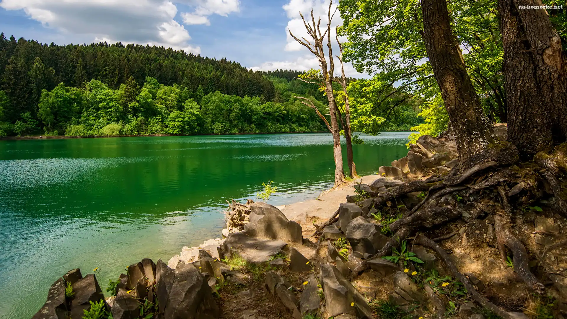 Drzewa, Wzgórze, Rzeka, Roślinność, Las, Kamienie na Komórkę