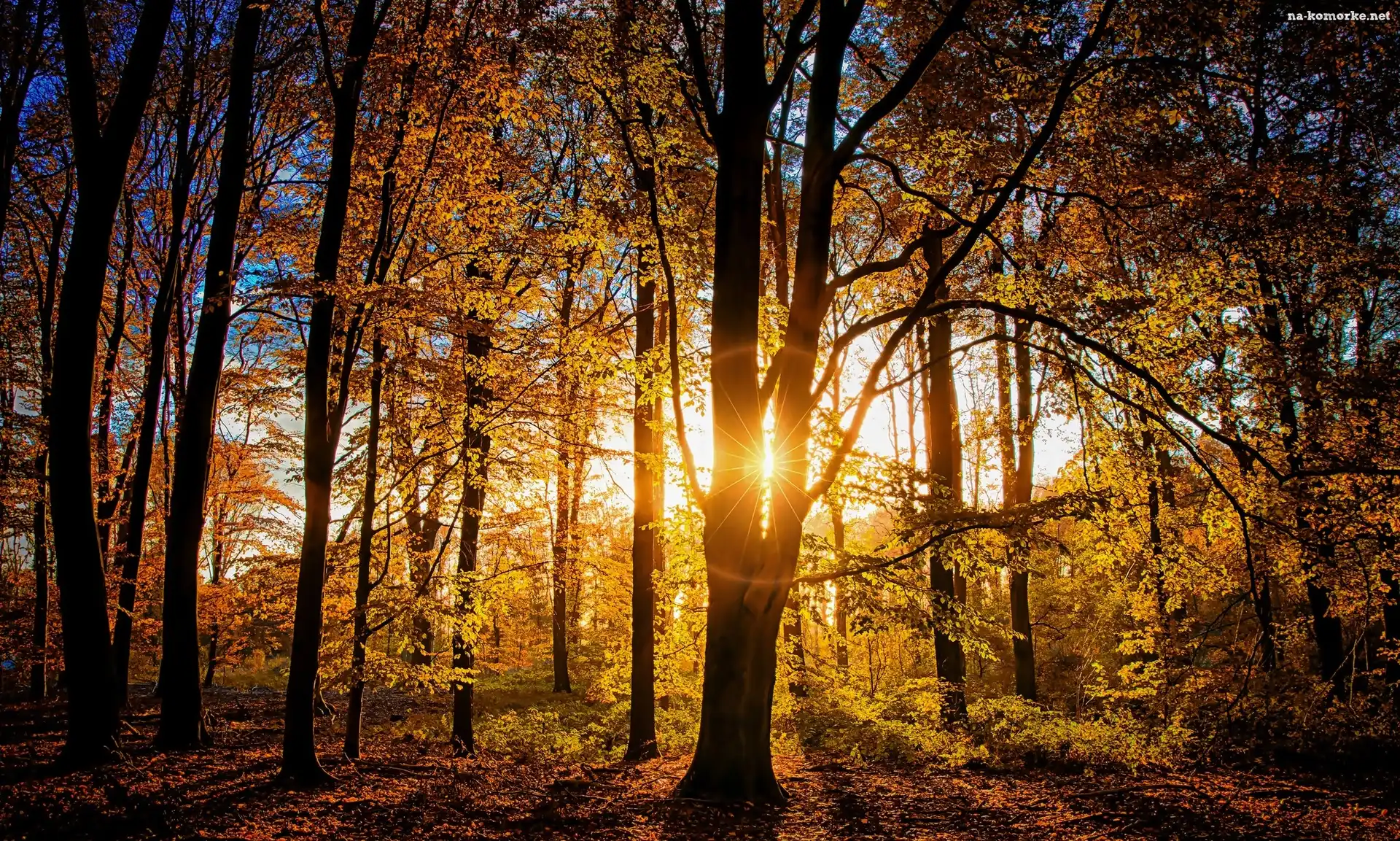 Drzewa, Promienie słońca, Las, Jesień na Komórkę