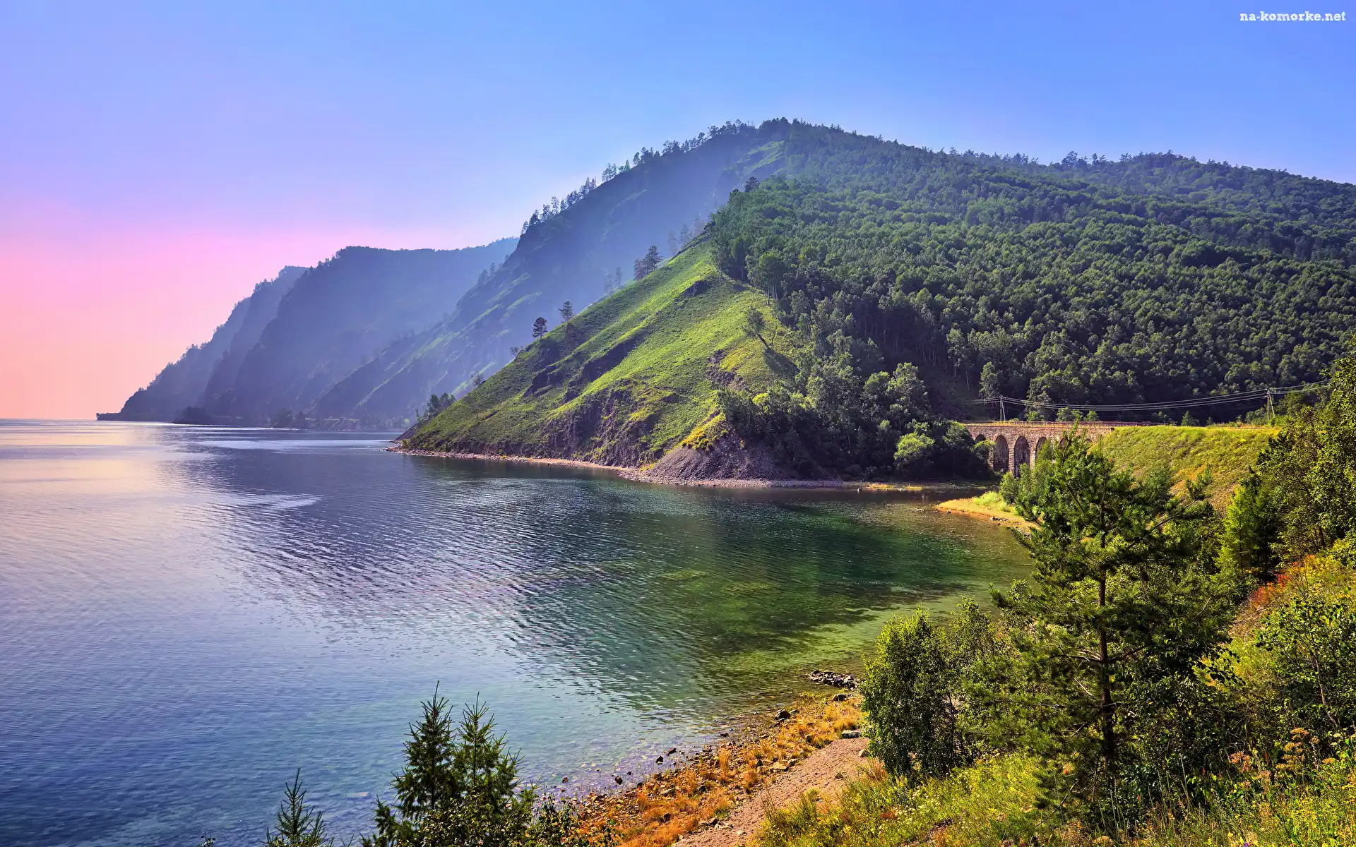 Drzewa, Wzgórze, Góry, Most, Lasy, Jezioro na Komórkę