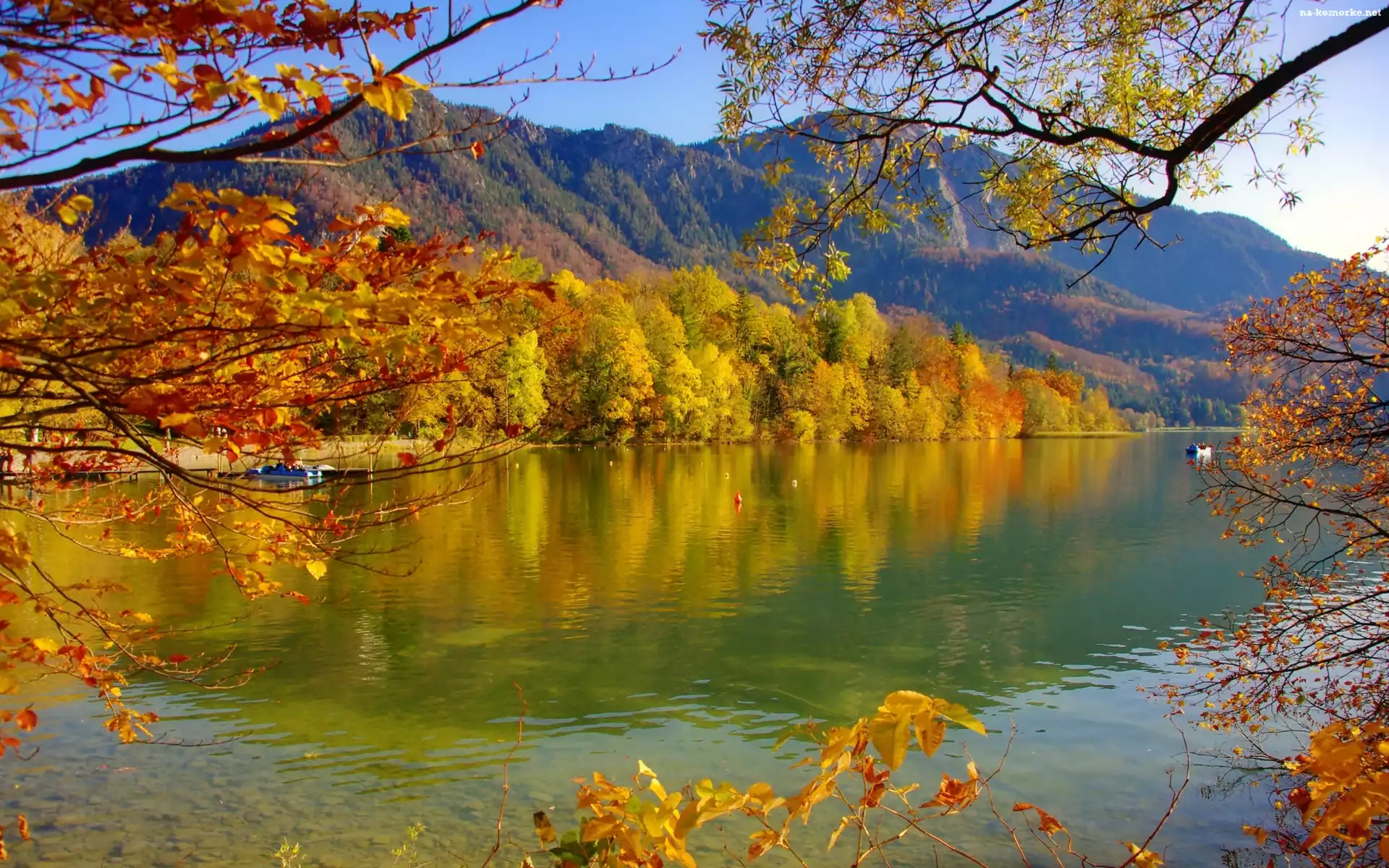Drzewa, Góry, Jezioro, Jesień, Lasy, Łódki na Komórkę