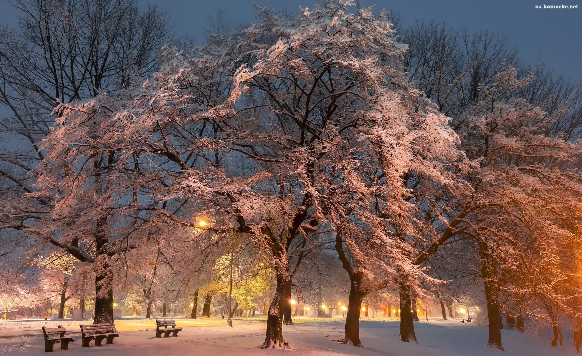 Drzewa, Zima, Park, Latarnie, Zmrok na Komórkę