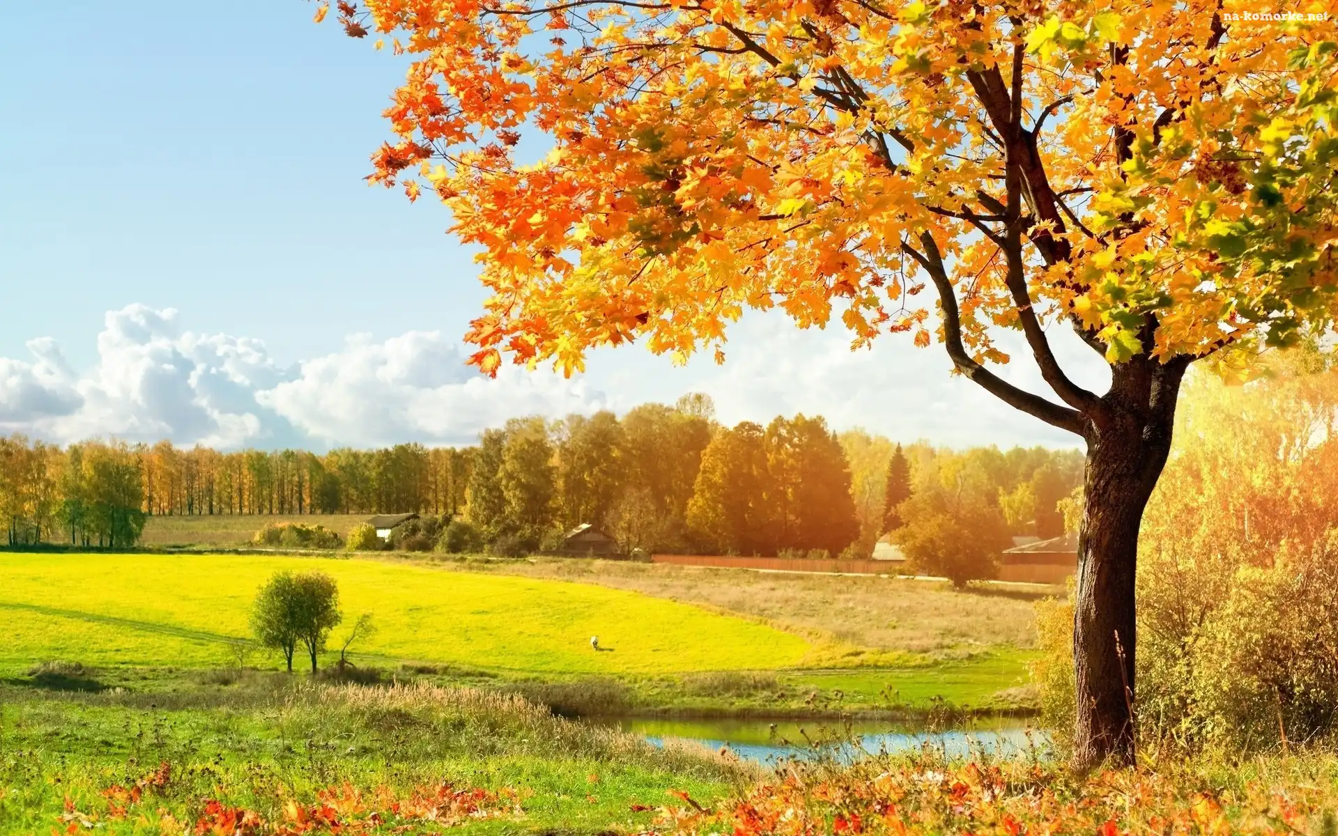 Drzewa, Woda, Liście, Trawa na Komórkę