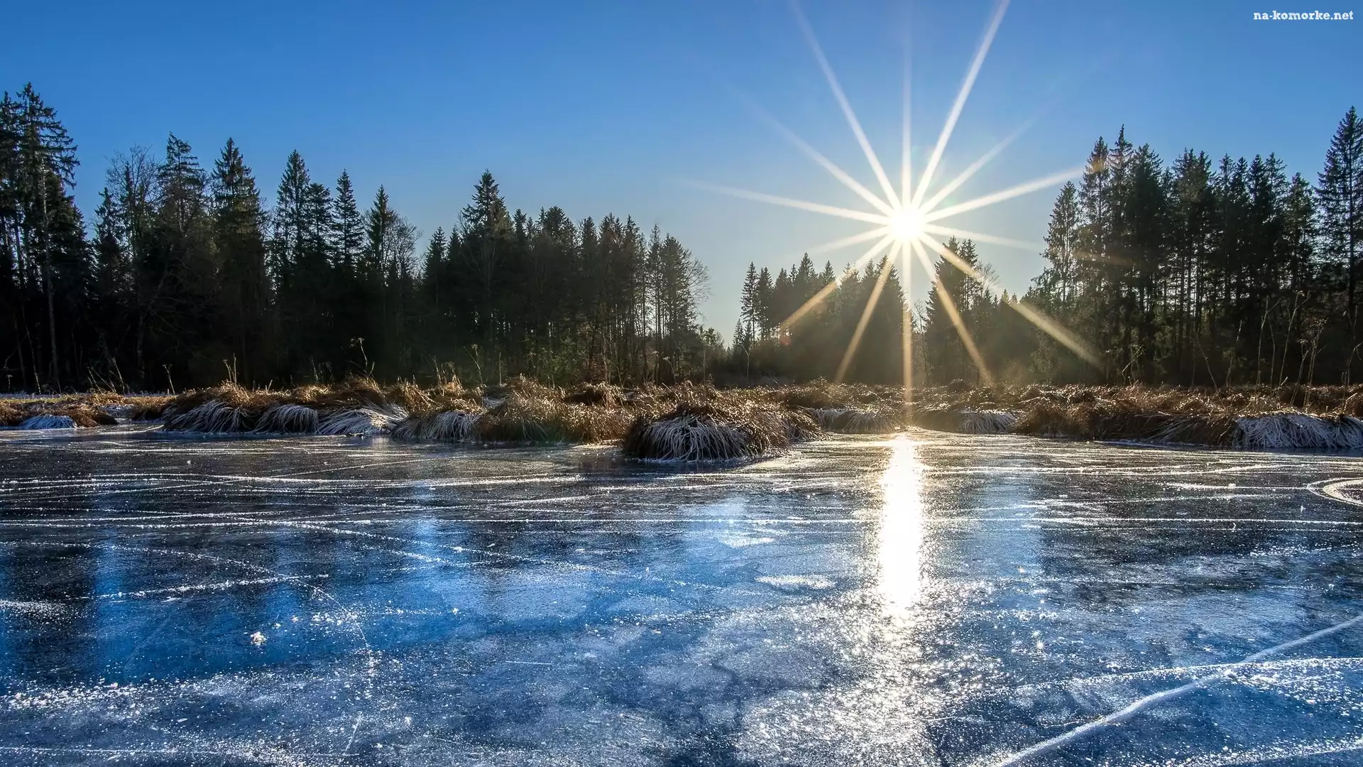 Lód, Drzewa, Zima, Jezioro, Trawa, Promienie słońca na Komórkę