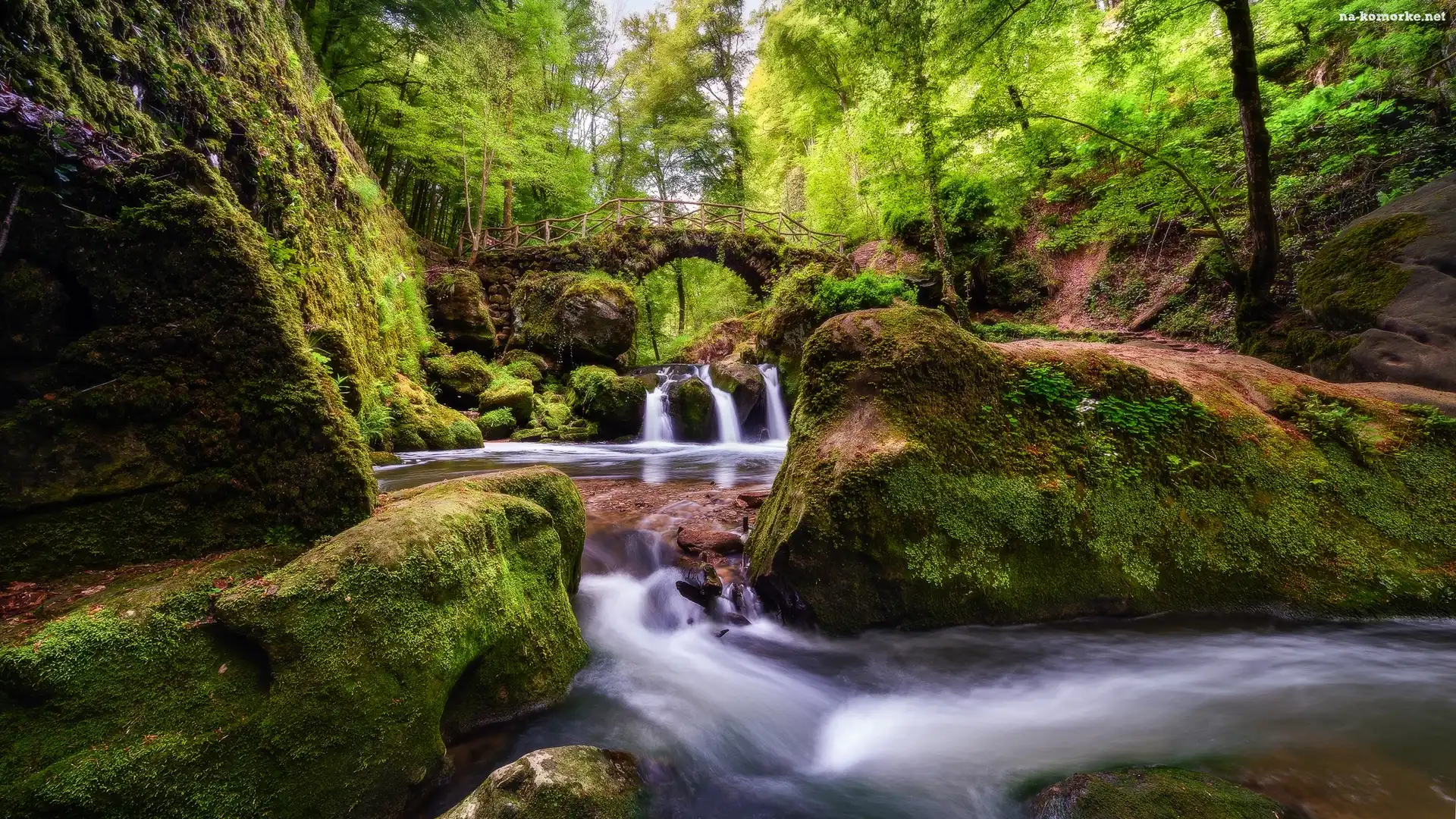 Rzeka, Las, Drzewa, Most, Luksemburg, Wodospad Schiessentumpel, Mullerthal, Skały, Mała Szwajcaria na Komórkę |