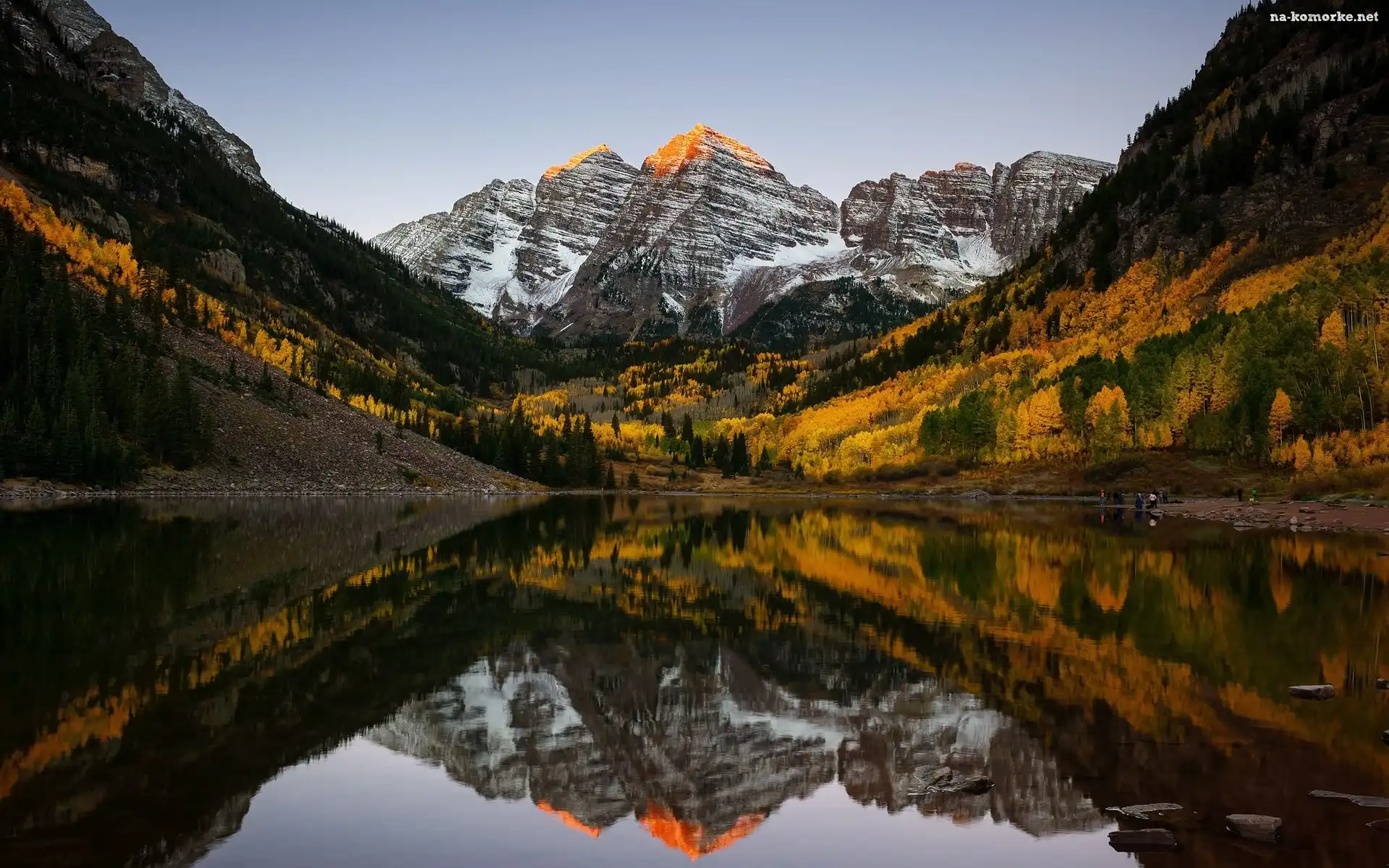Góry Skaliste, Odbicie, Jezioro Maroon Lake, Stany Zjednoczone, Drzewa, Jesień, Szczyty Maroon Bells, Kolorado na Komórkę |