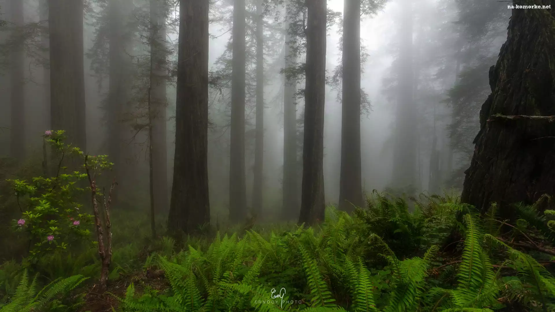 Las, Drzewa, Mgła, Wysokie, Paprocie na Komórkę