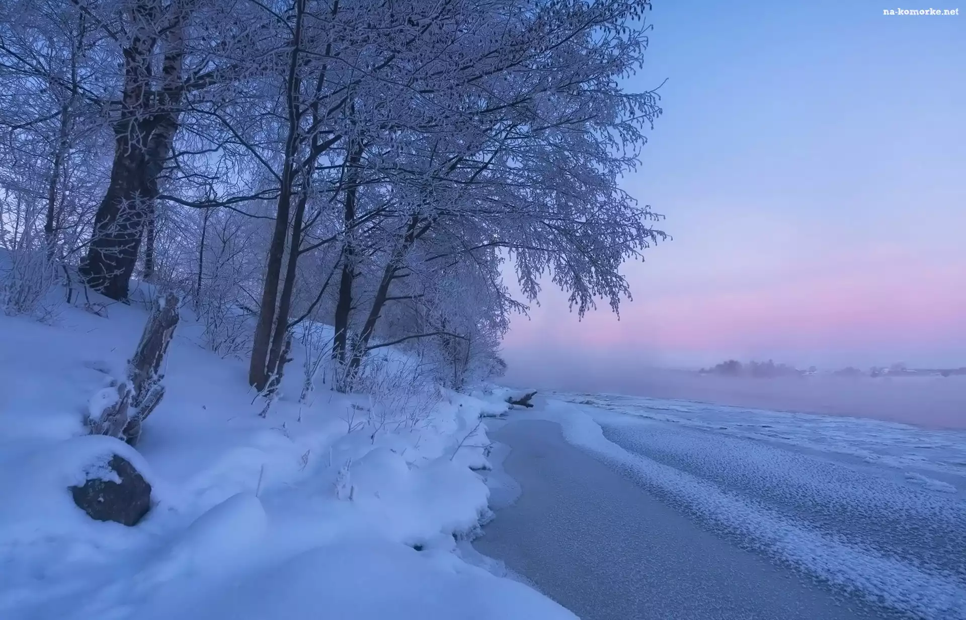 Drzewa, Zima, Rzeka, Mgła, Ośnieżone na Komórkę