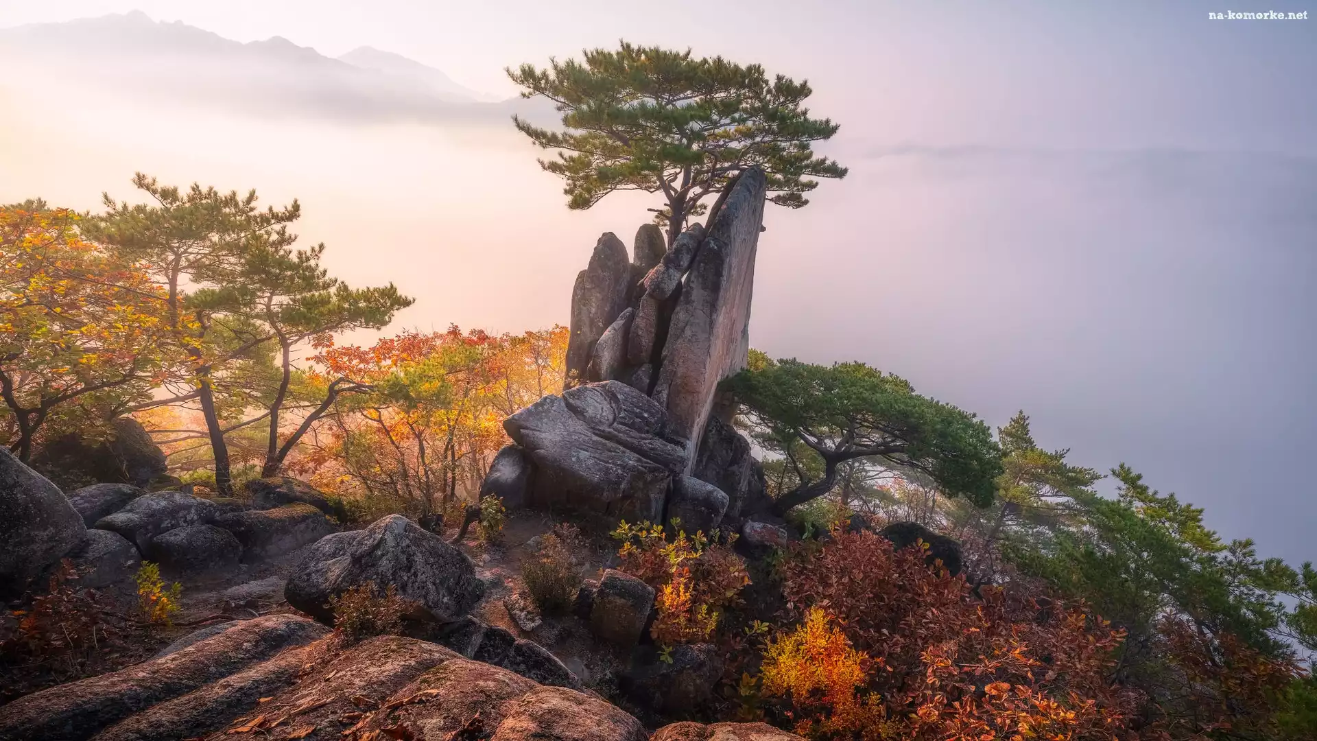 Mgła, Jesień, Skały, Drzewa na Komórkę