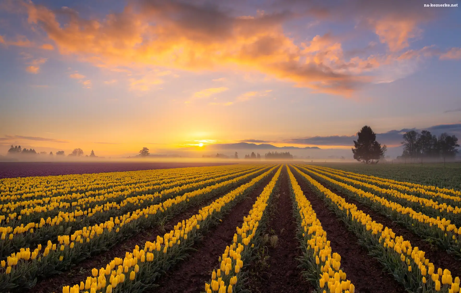 Tulipany, Drzewa, Chmury, Żółte, Plantacja, Wschód słońca, Mgła na Komórkę