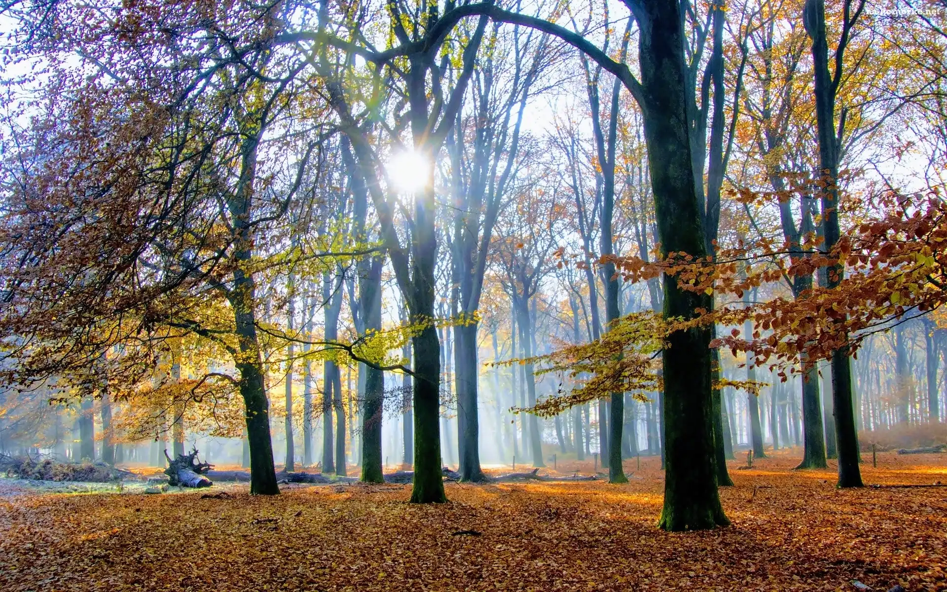 Mgła, Drzewa, Las, Jesień, Promienie słońca, Świt na Komórkę