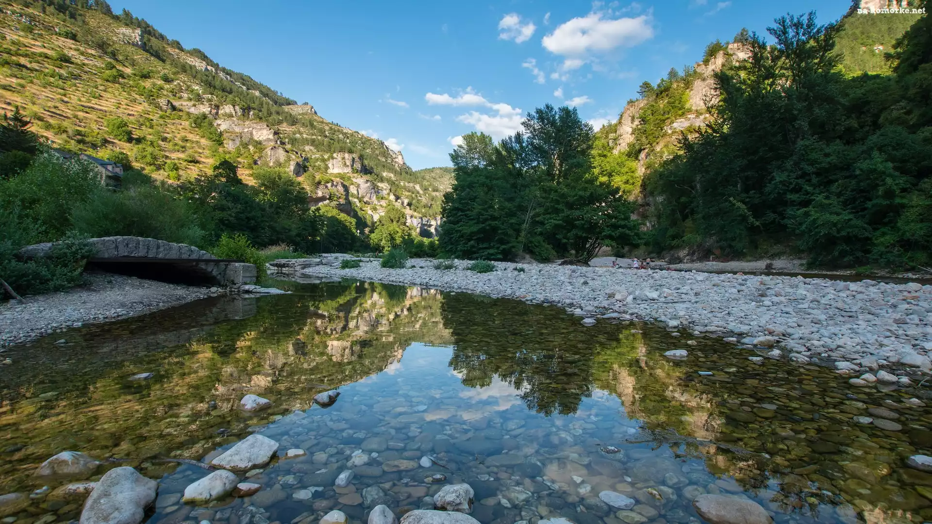 Drzewa, Góry, Rzeka, Most, Kamienie na Komórkę