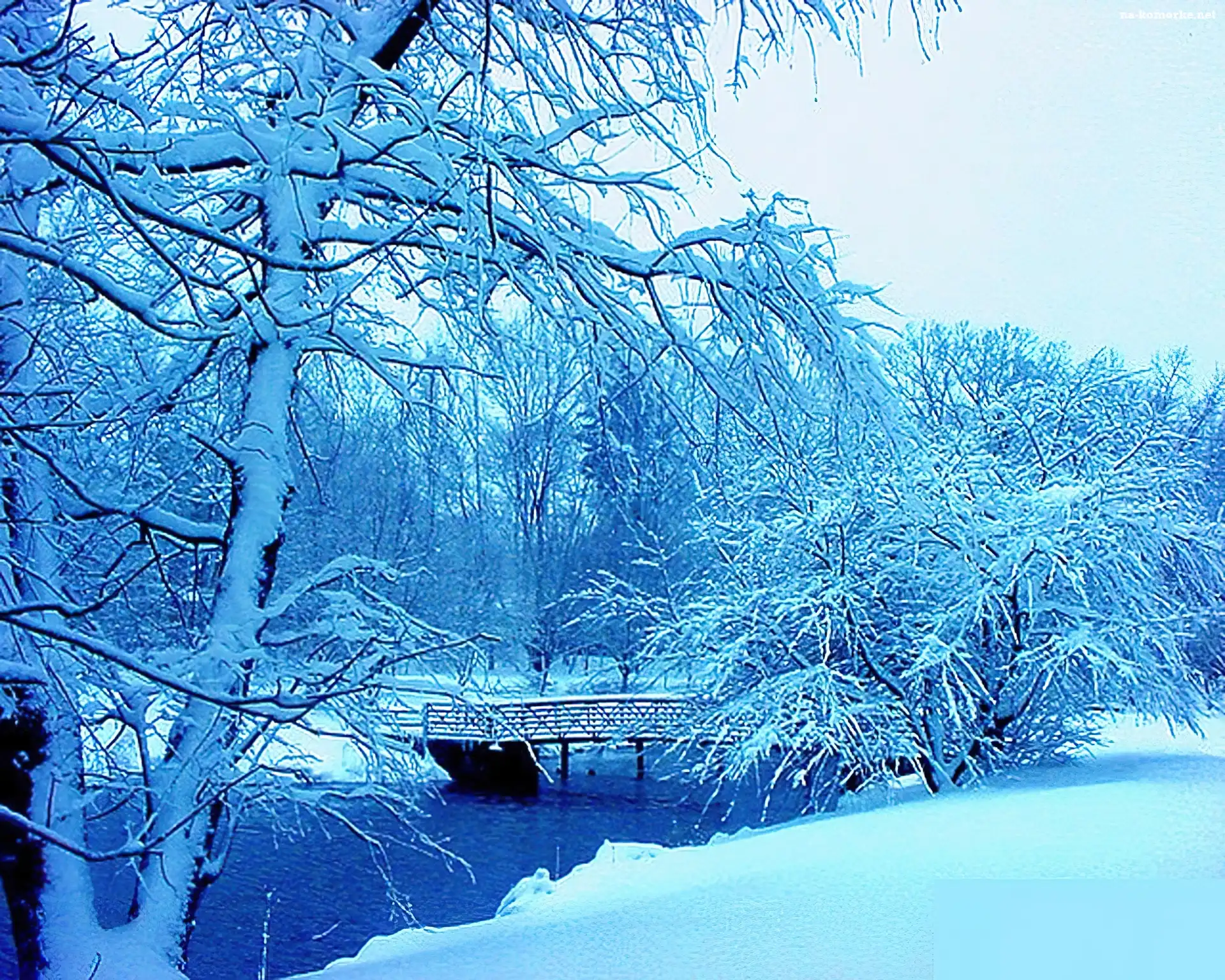 Drzewa, Zima, Rzeka, Mostek, Ośnieżone na Komórkę