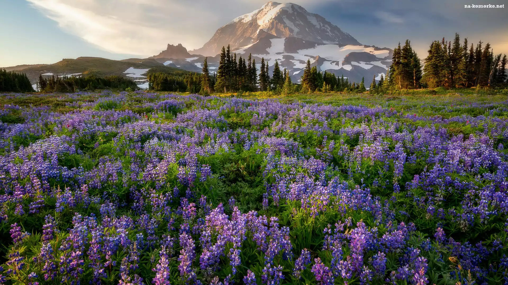 Park Narodowy Mount Rainier, Stratowulkan, Stany Zjednoczone, Drzewa, Łubiny, Łąka, Góry, Mount Rainier, Stan Waszyngton na Komórkę |