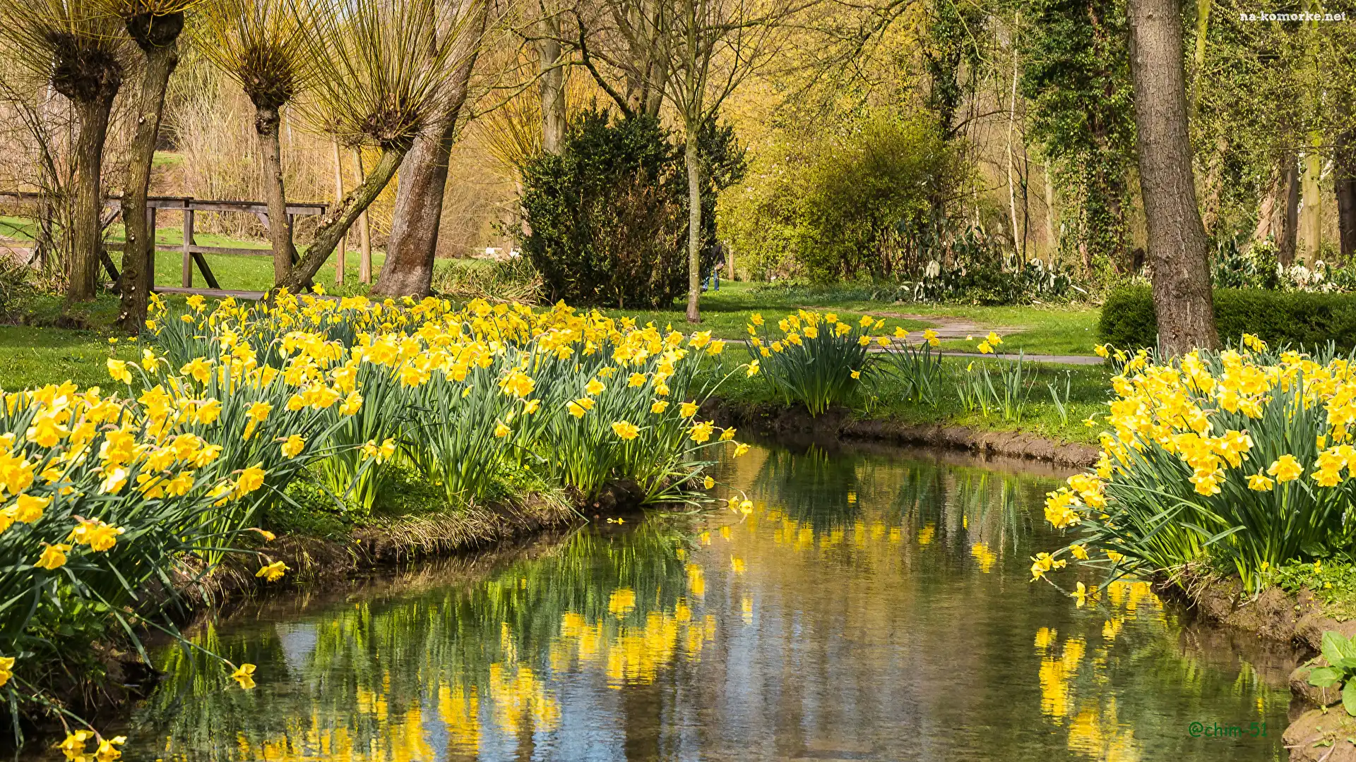Drzewa, Wiosna, Park, Strumyk, Narcyzy żonkile na Komórkę