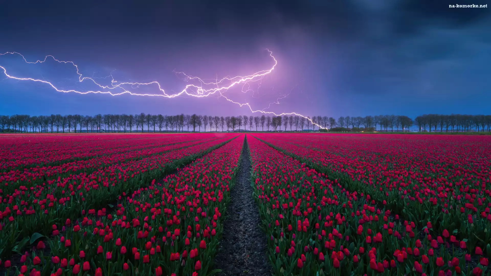 Kwiaty, Tulipany, Niebo, Drzewa, Wieczór, Pole, Błyskawica na Komórkę