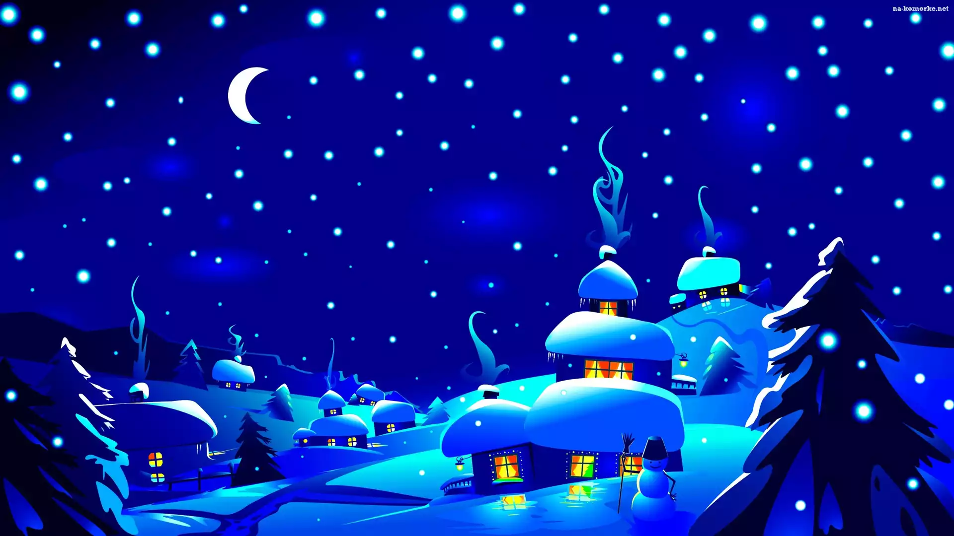 Drzewa, Domy, Wieś, Księżyc, Śnieg, Noc na Komórkę