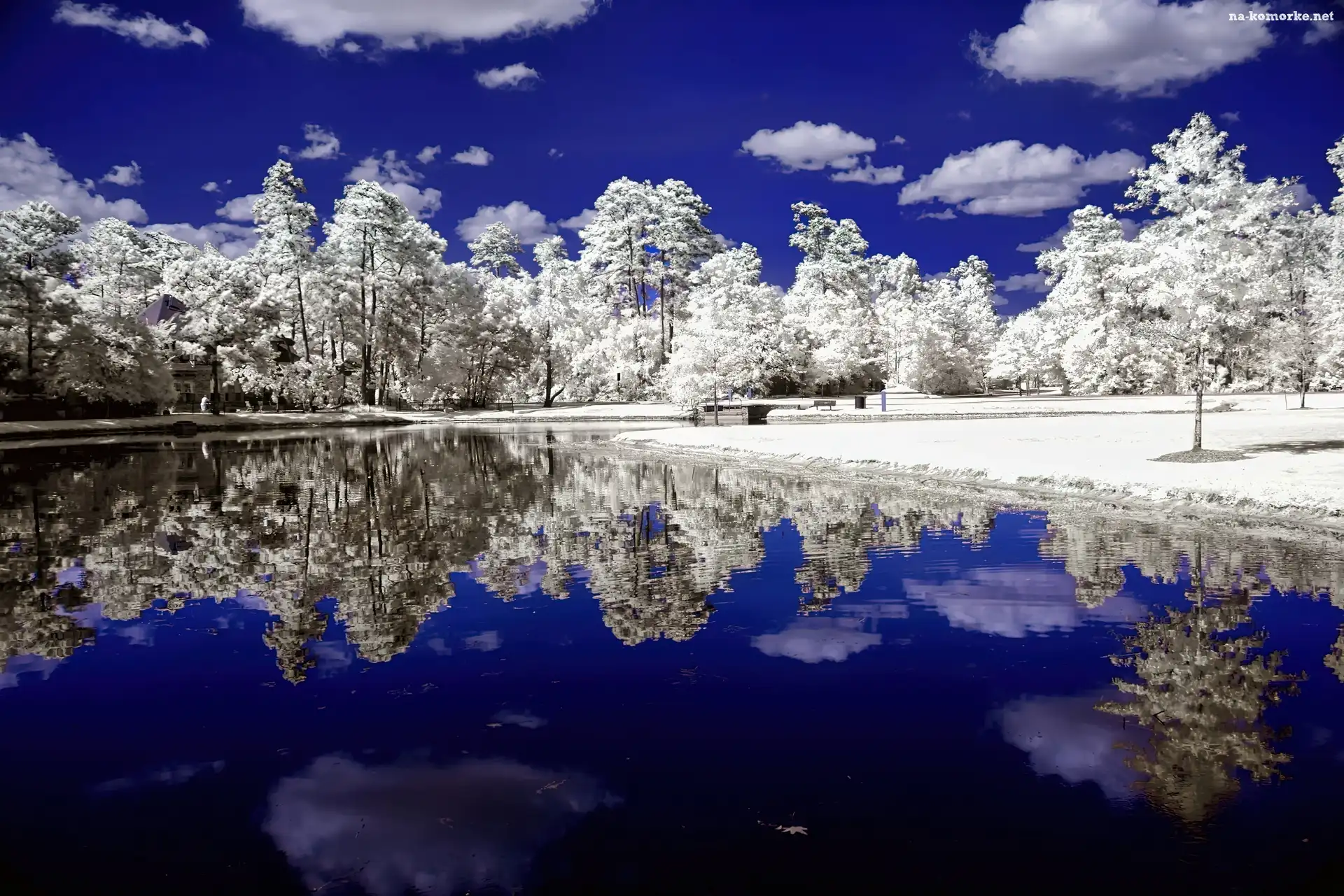 Drzewa, Zima, Śnieg, Rzeka na Komórkę