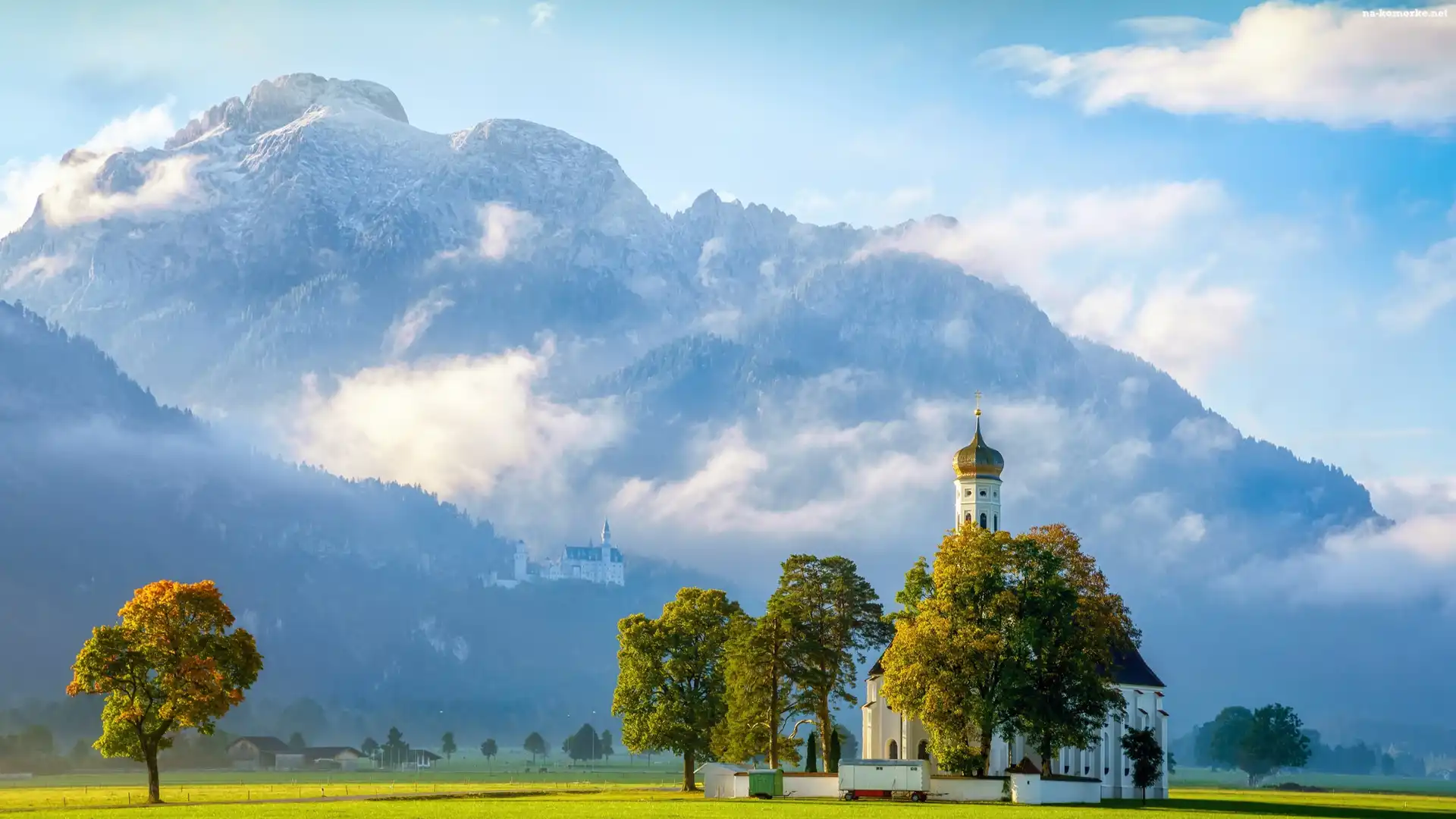 Niemcy, Kościół św. Kolomana, Drzewa, Schwangau, Chmury, Mgła, Bawaria, Zamek Neuschwanstein, Alpy, Masyw Tegelberg na Komórkę |