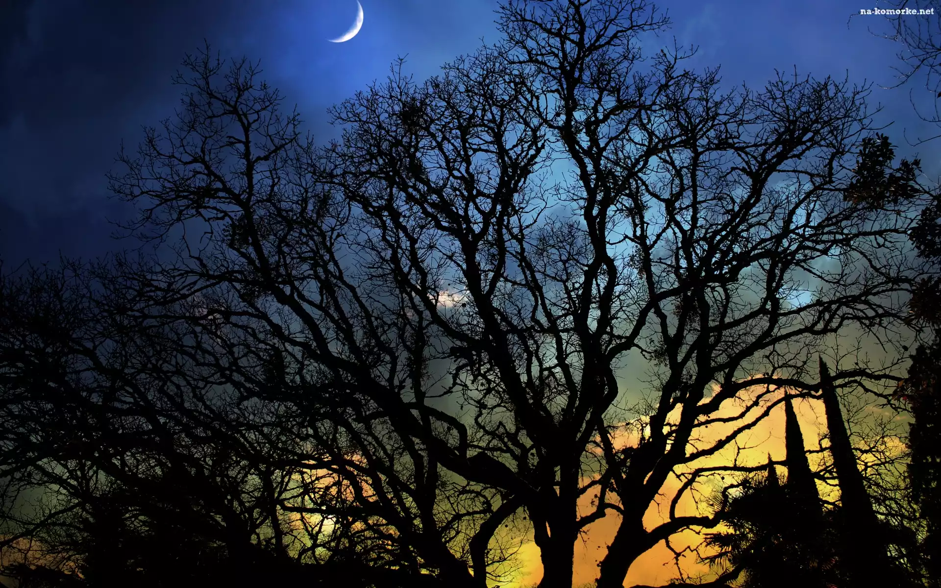 Drzewa, Księżyc, Niebo, Blask, Noc, Cień na Komórkę