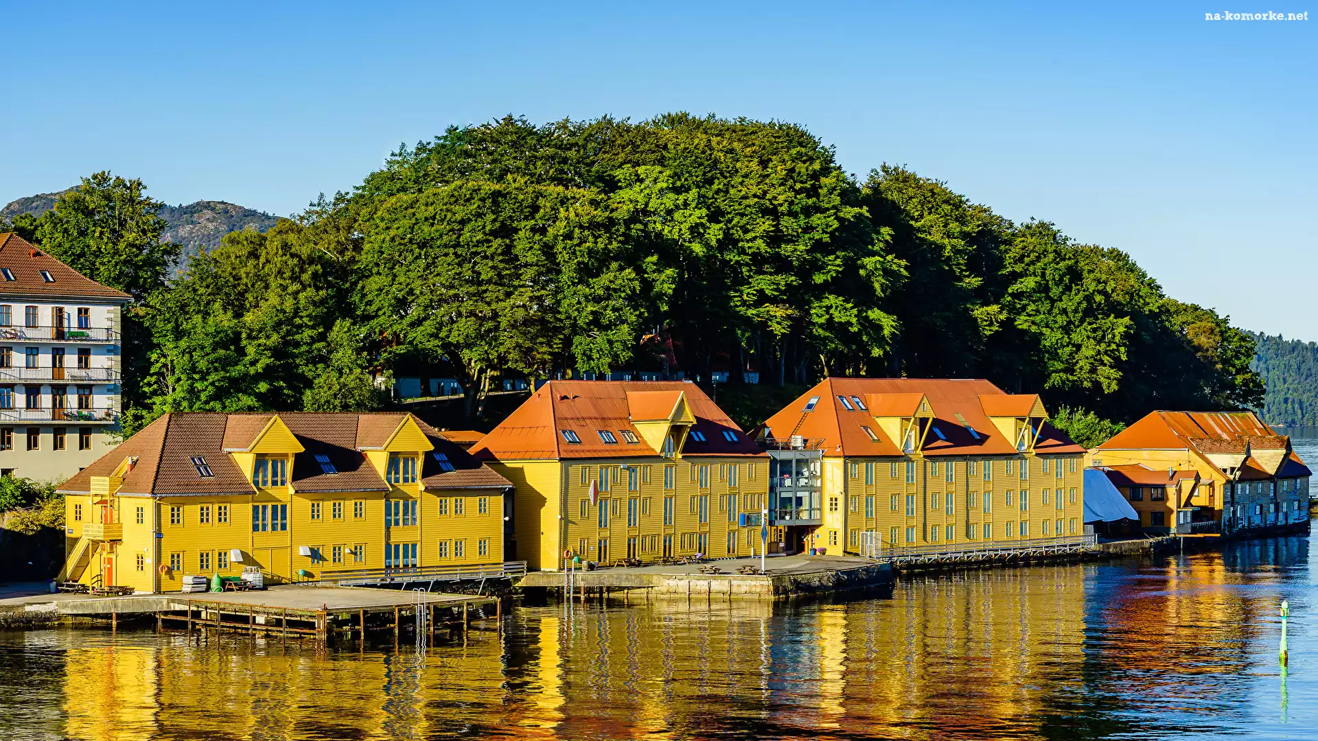 Przystań, Domy, Norwegia, Drzewa, Rzeka, Pomosty, Bergen na Komórkę