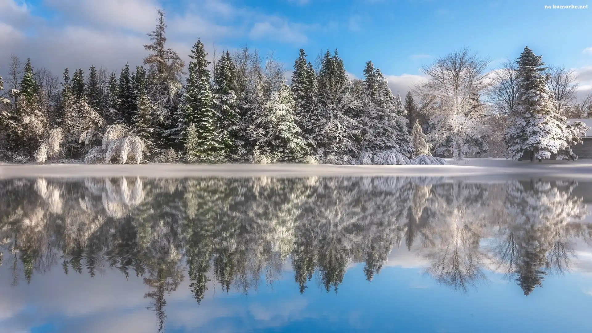 Kanada, Rzeka, Odbicie, Prowincja Nowy Brunszwik, Zima, Ośnieżone, Drzewa na Komórkę