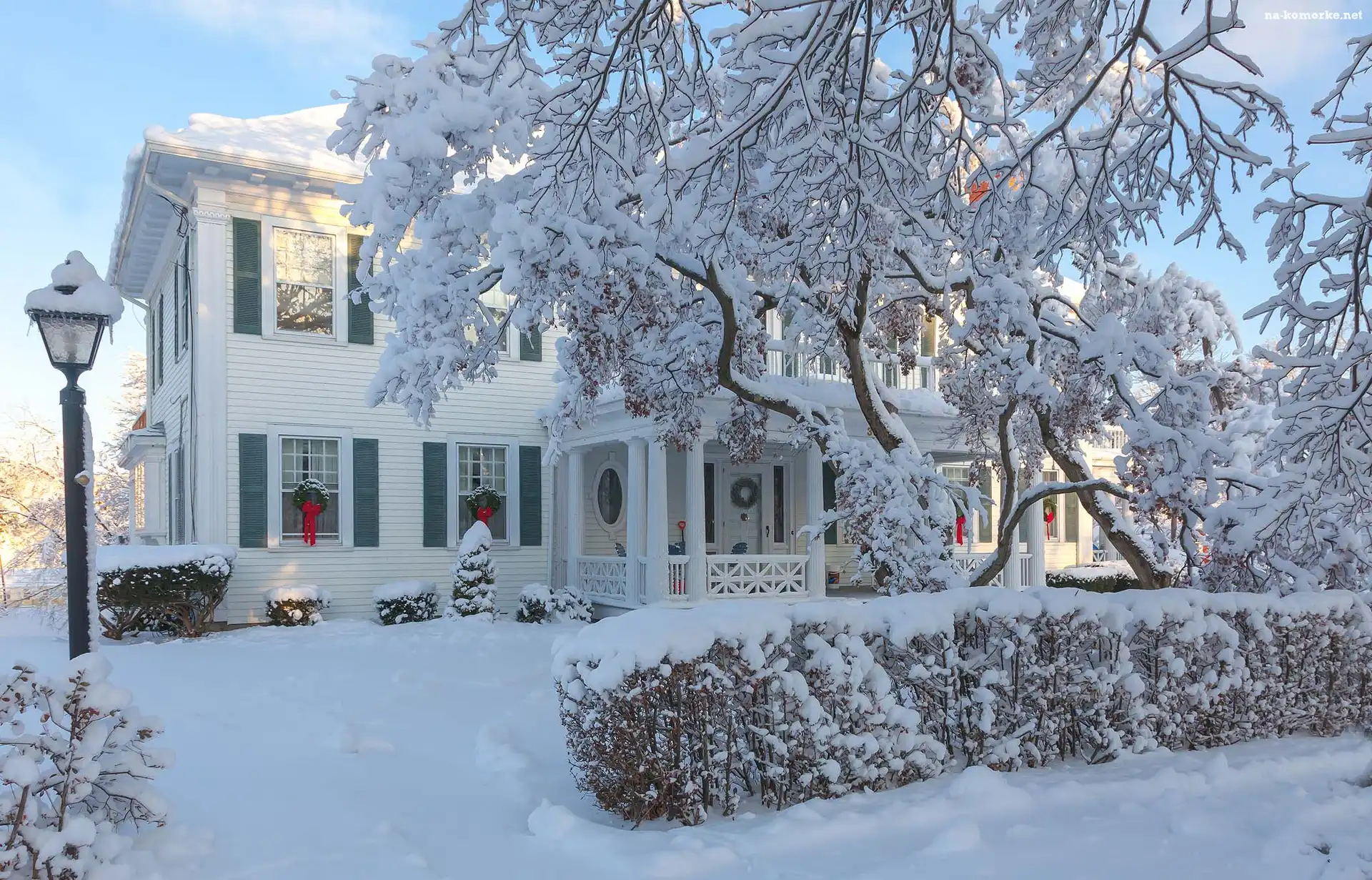 Drzewa, Dom, Zima, Latarnia, Ośnieżone, Krzewy na Komórkę