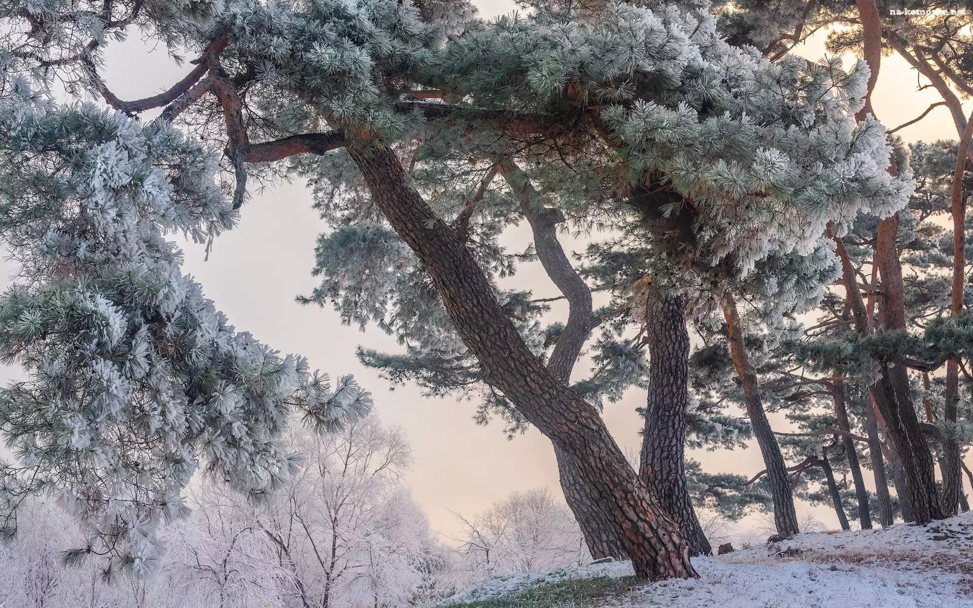Drzewa, Zima, Oszronione, Sosny na Komórkę