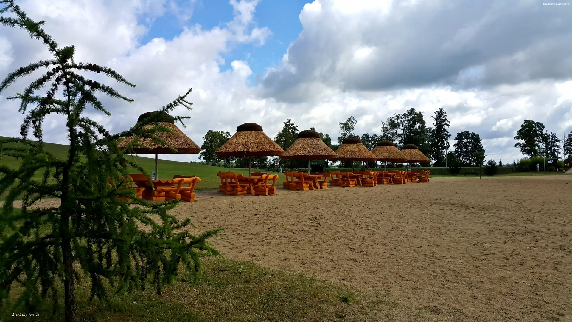 Drzewa, Chmury, Niebo, Ławki, Piasek, Parasole na Komórkę
