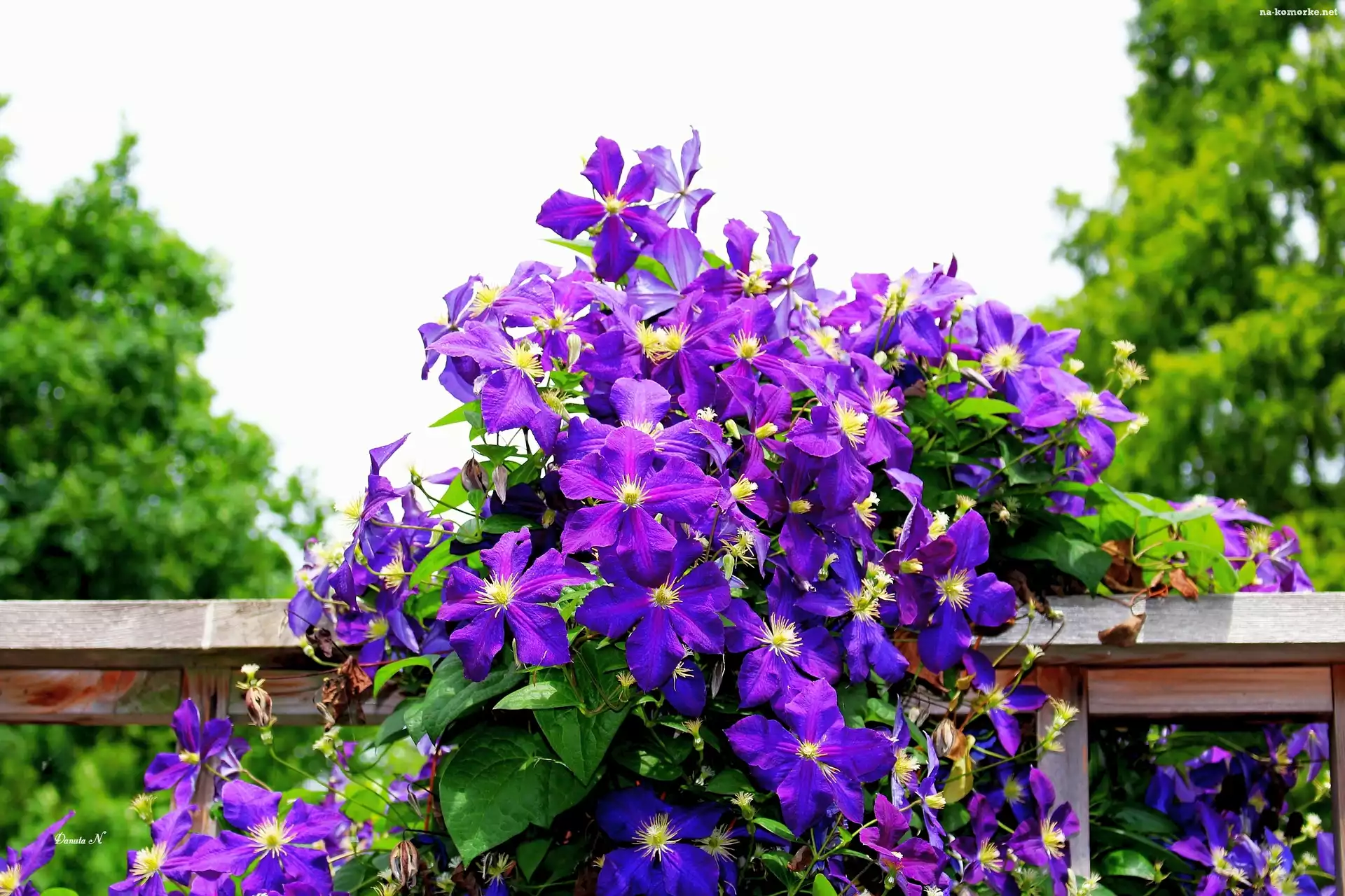 Drzewa, Fioletowy, Clematis, Lato, Płot, Liście na Komórkę