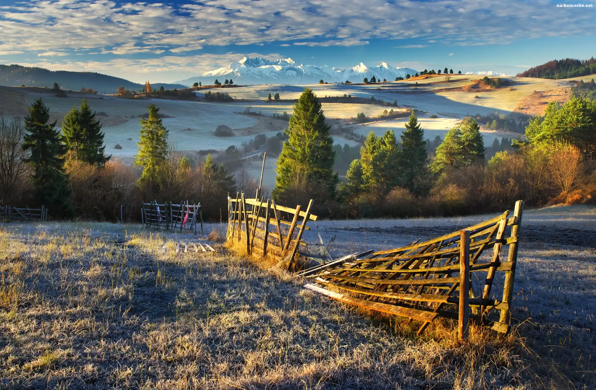 Polska, Drzewa, Przymrozek, Góry Tatry, Wzgórza, Pola, Płot na Komórkę