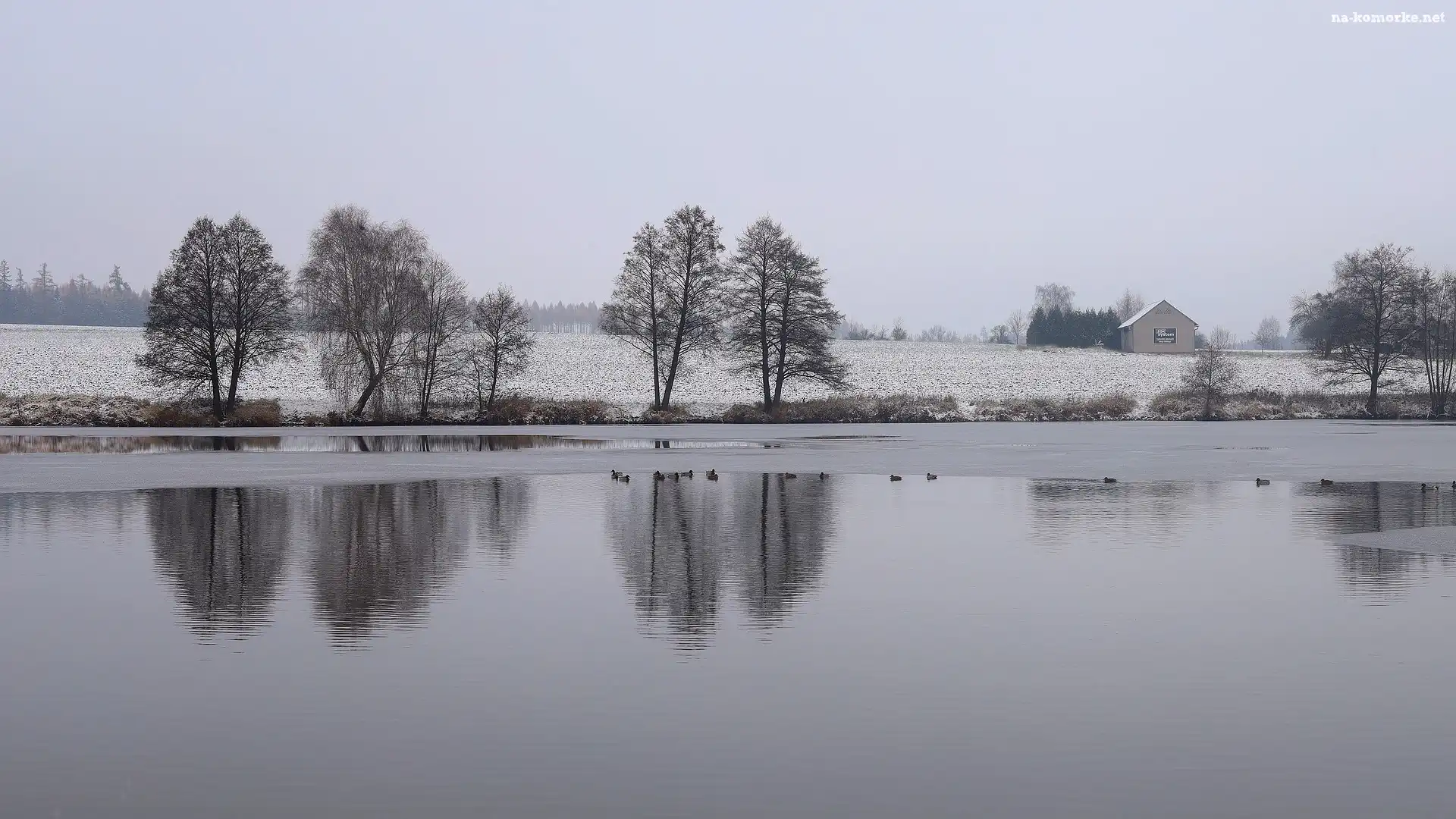Zima, Drzewa, Pole, Jezioro, Kaczki na Komórkę