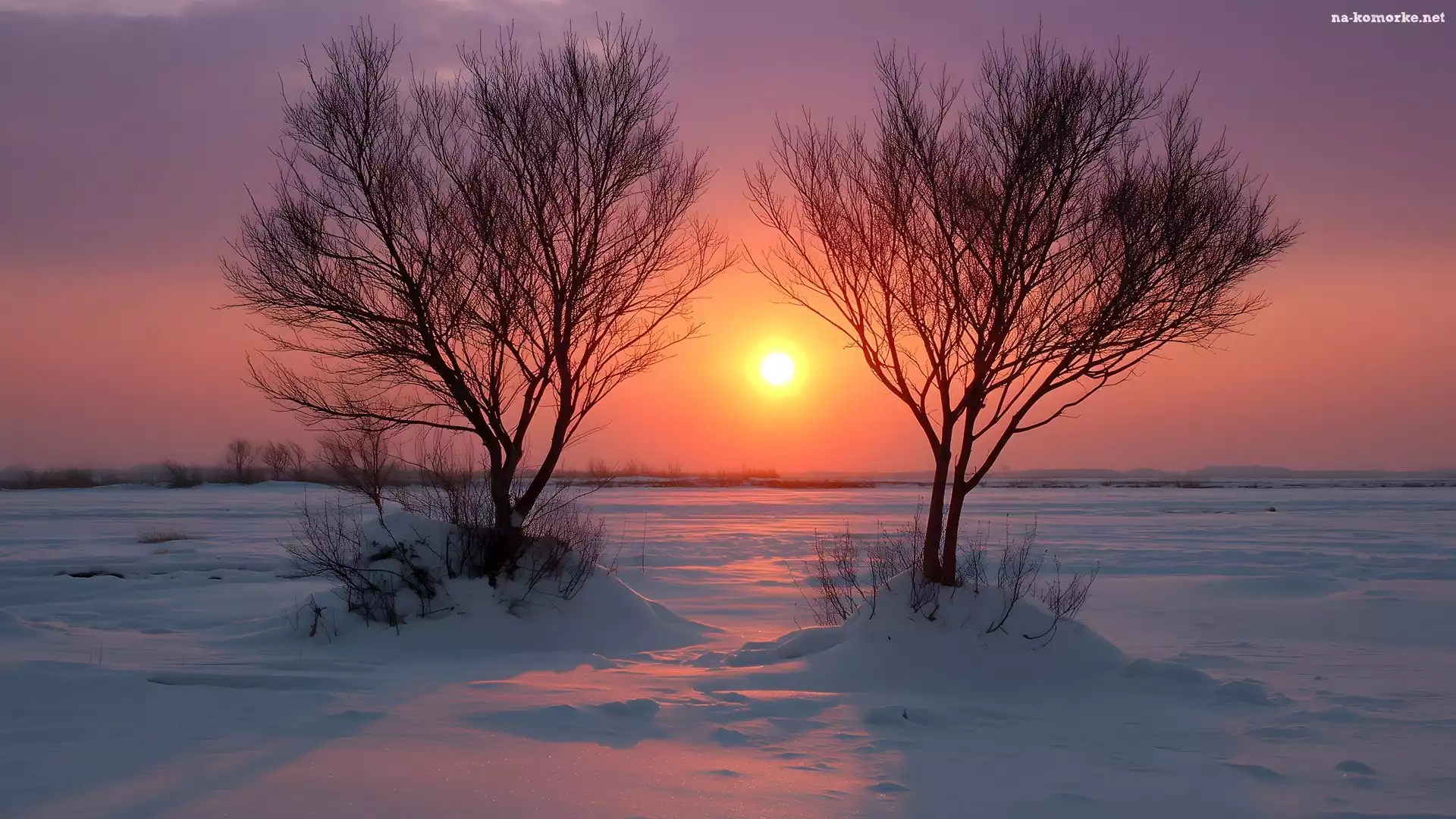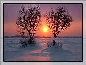 Dwa, Zima, Pole, Drzewa, Ośnieżone, Zachód słońca na Komórkę