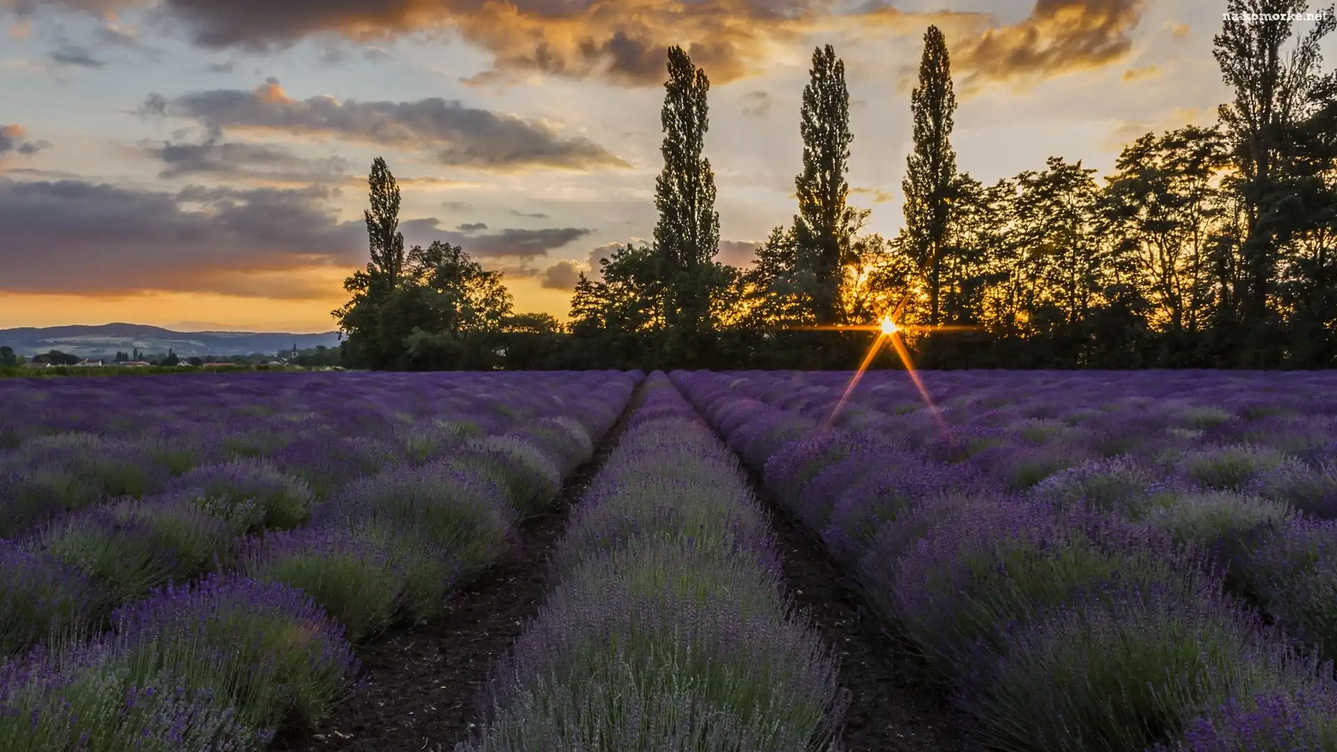 Drzewa, Zachód, Słońca, Promienie, Lawenda na Komórkę