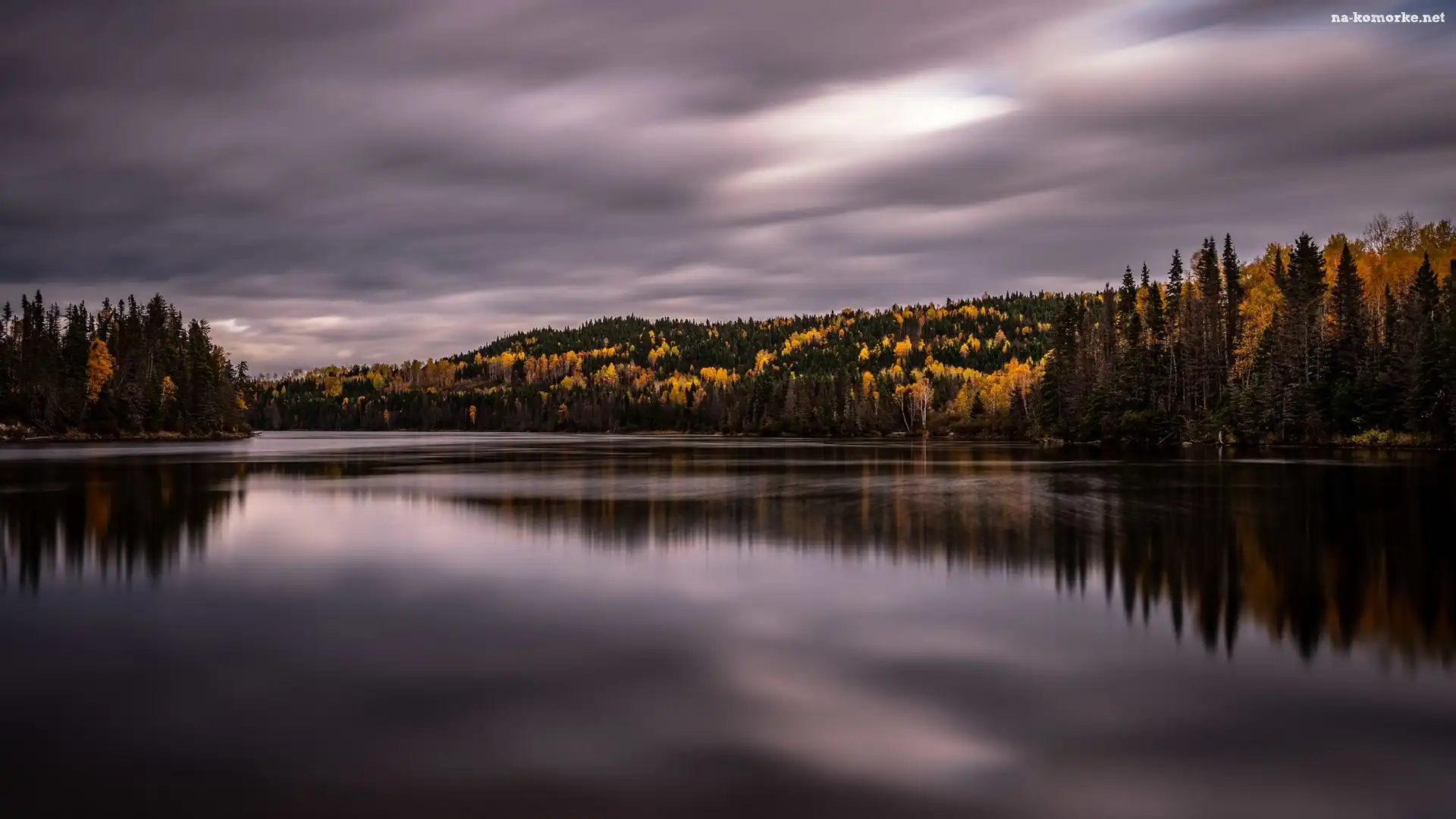 Rzeka Manicouagan, Quebec, Lasy, Kanada, Zachmurzone, Niebo, Drzewa na Komórkę