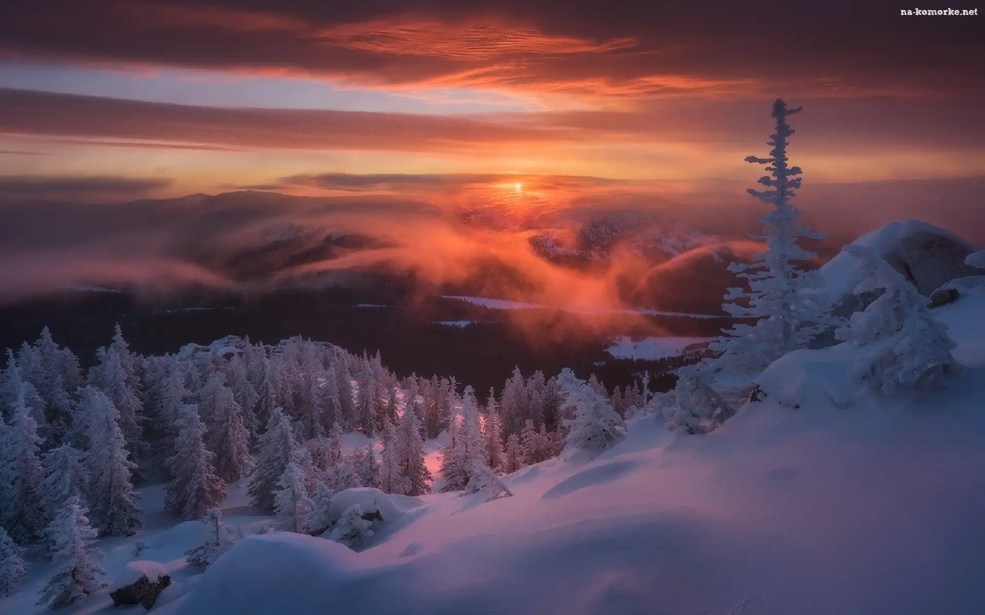 Rosja, Ośnieżone, Park Narodowy Taganaj, Drzewa, Góry Ural, Zima, Wschód słońca, Zima na Komórkę |
