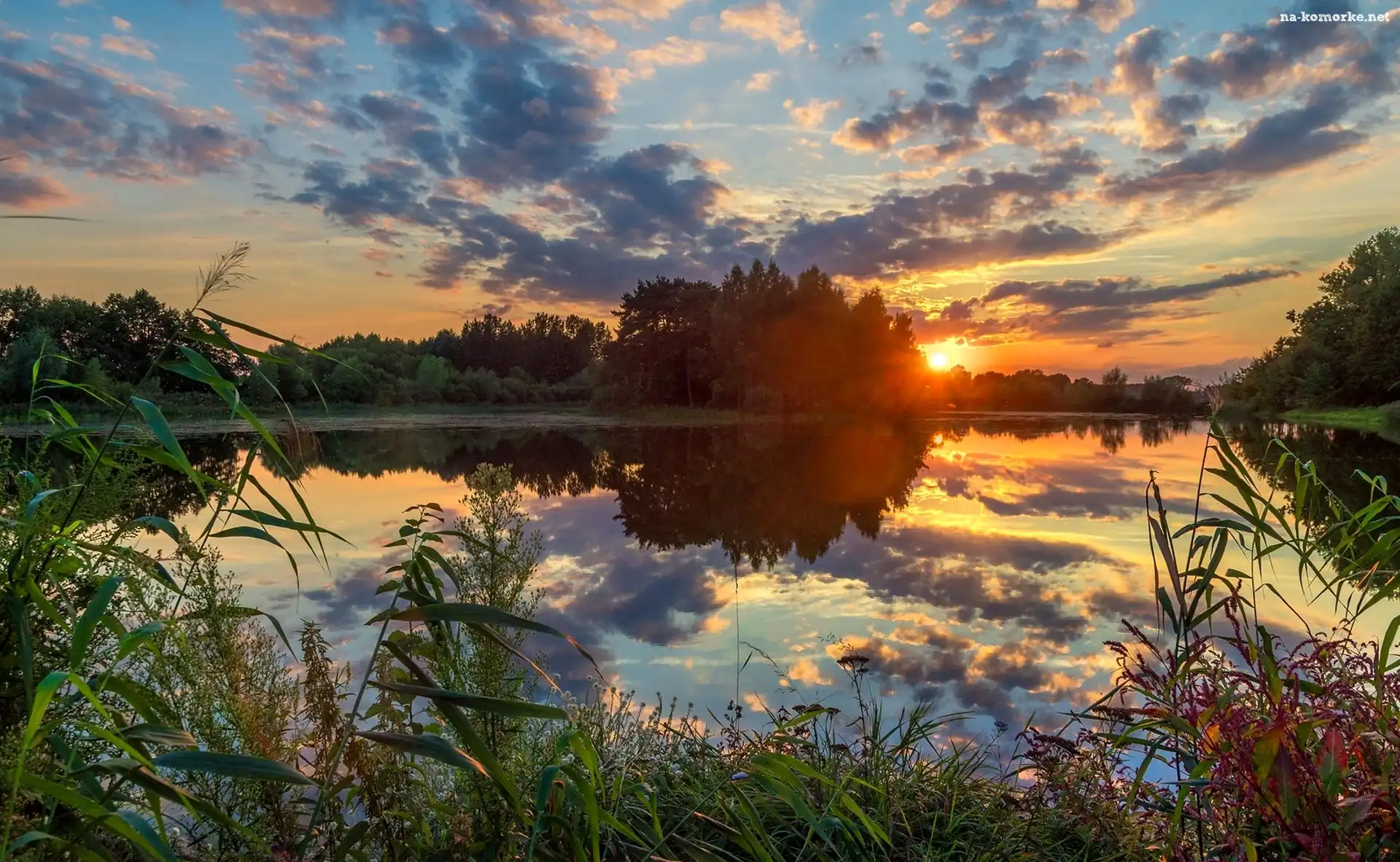 Rośliny, Drzewa, Jezioro, Odbicie, Chmury, Zachód słońca na Komórkę
