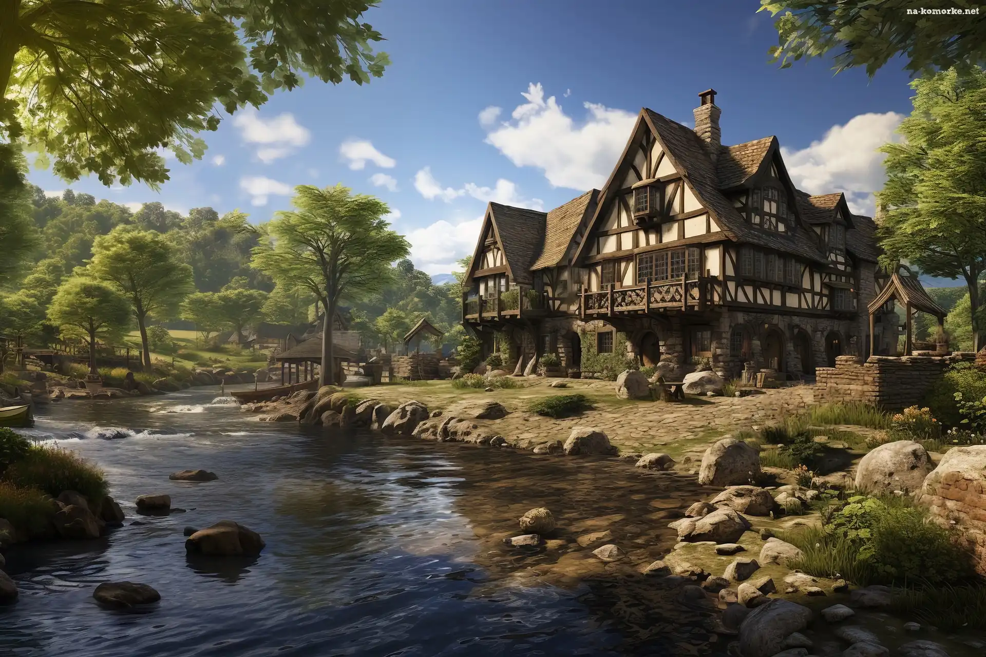 Rzeka, Grafika, Dom, Drzewa na Komórkę