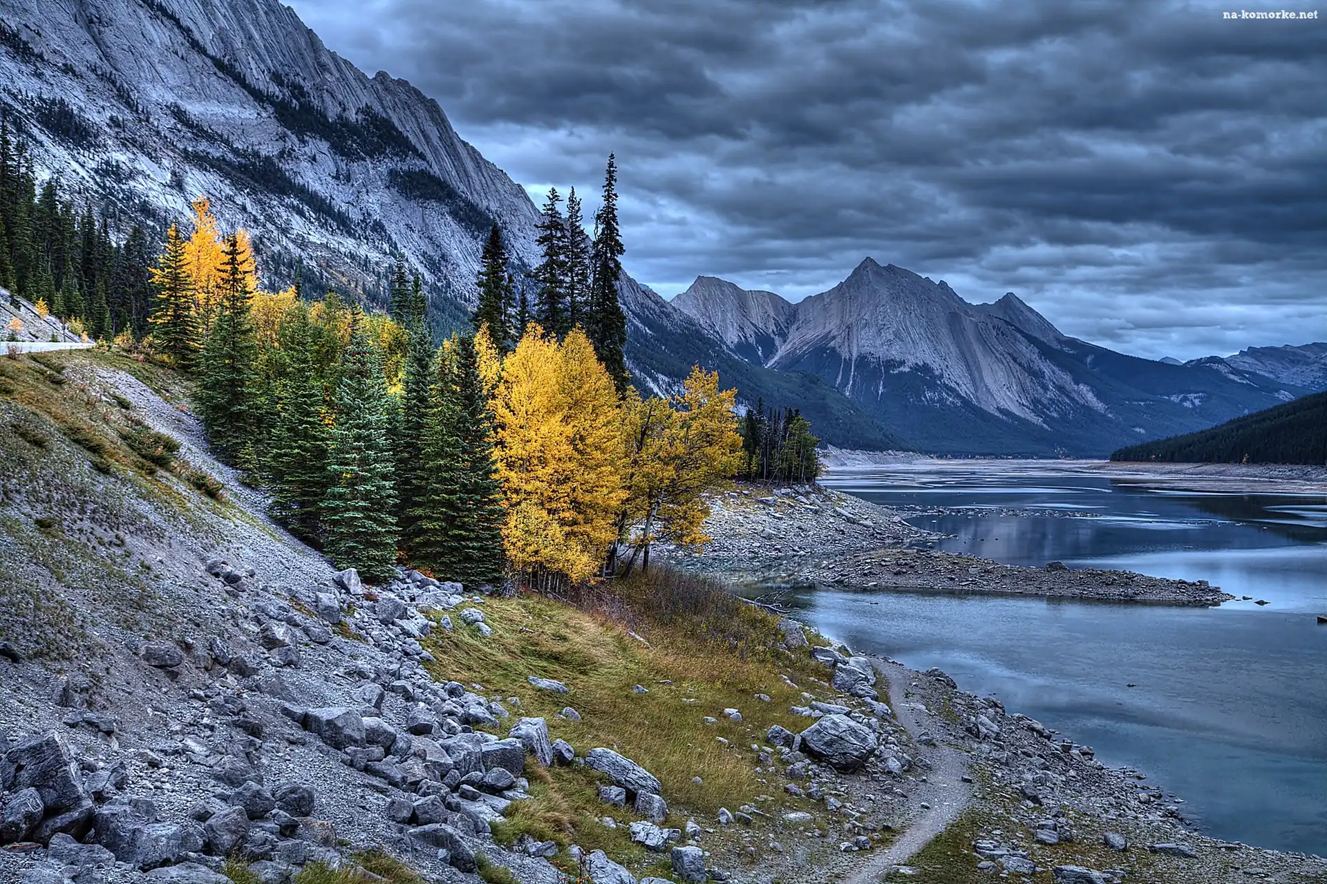 Drzewa, Jesień, Góry, Rzeka, Kamienie na Komórkę