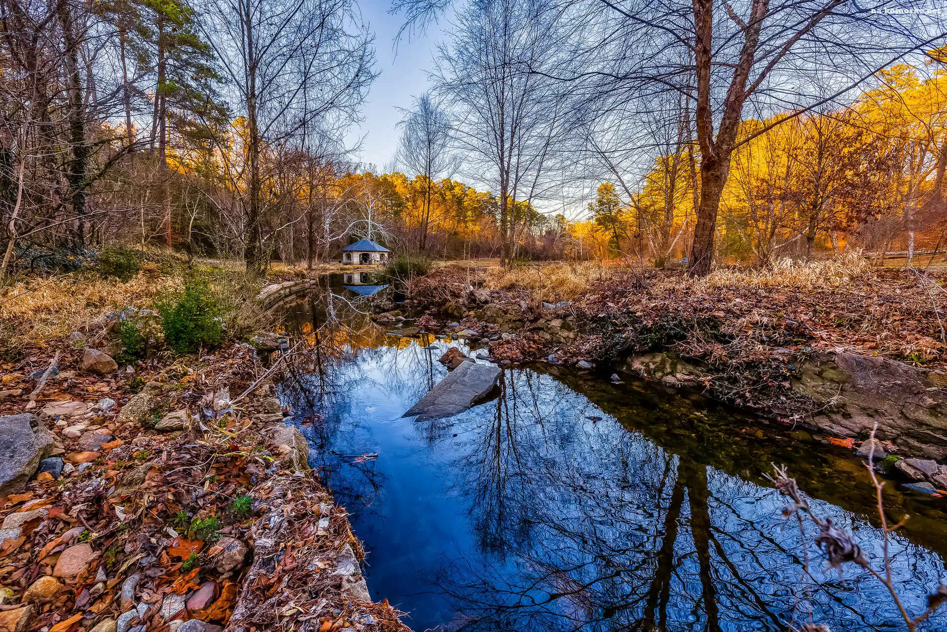 Trawy, Jesień, Pożółkłe, Drzewa, Domek, Rzeka na Komórkę