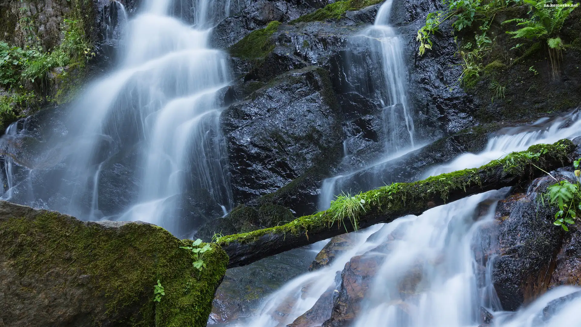 Drzewa, Wodospad, Omszałe, Skały, Pień na Komórkę