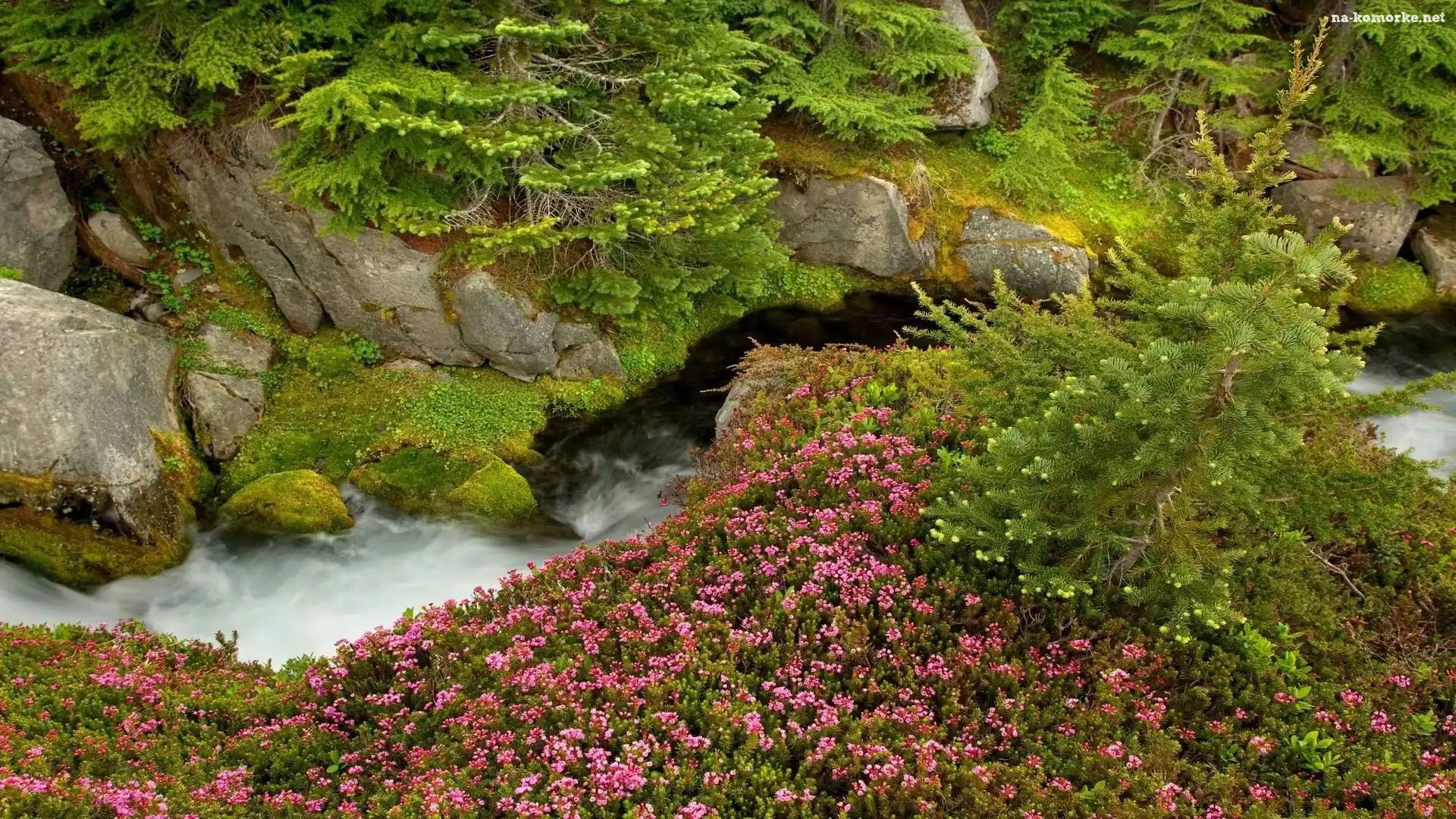 Drzewa, Górski, Potok, Mchy, Skały, Kwiatki na Komórkę