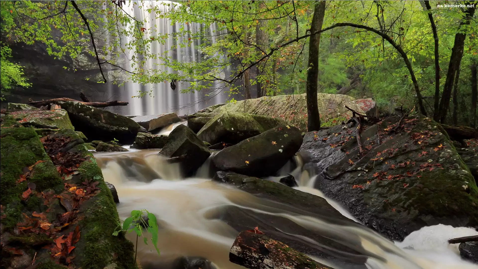 Drzewa, Wodospad, Skały, Kamienie na Komórkę