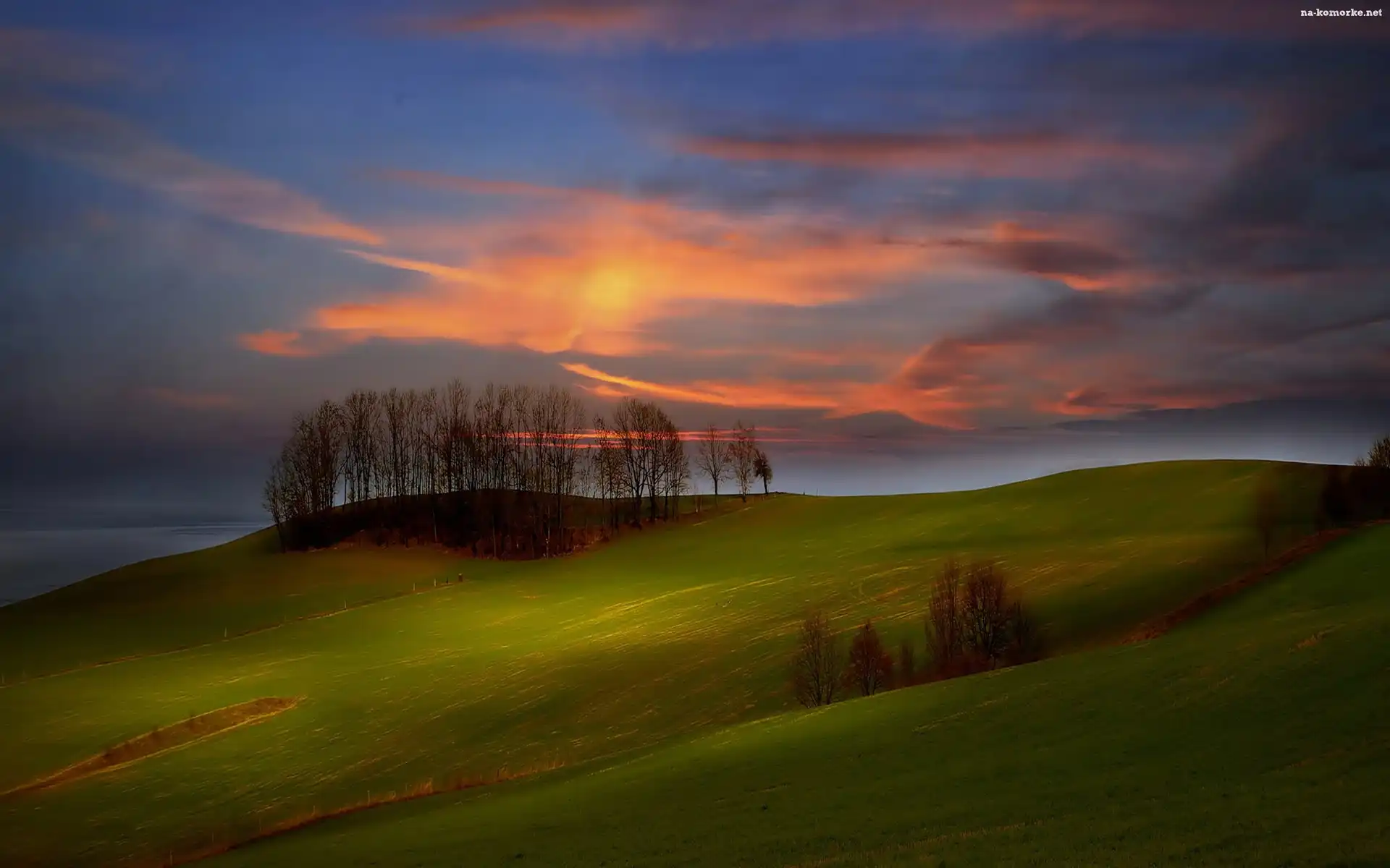 Drzewa, Zachód, Łąka, Wyżyny, Słońca, Niebo na Komórkę