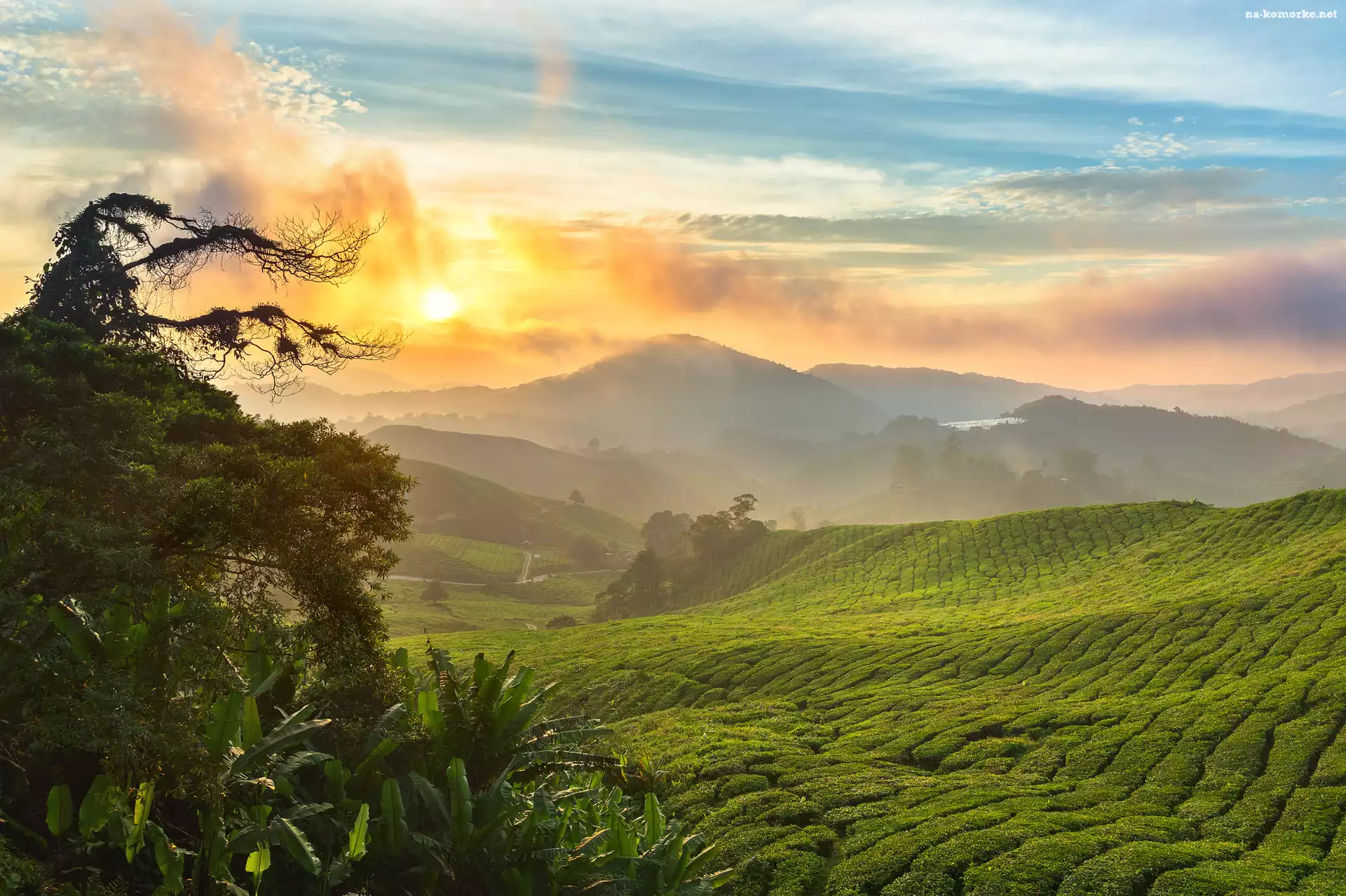Drzewa, Wzgórza, Wschód słońca, Plantacja, Malezja, Góry Cameron, Stan Pahang, Chmury, Cameron Highlands na Komórkę |