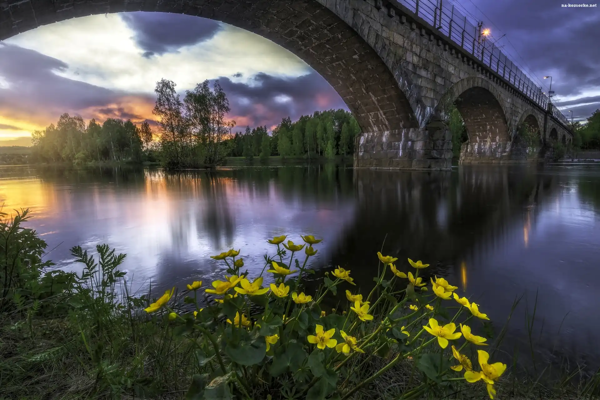 Drzewa, Most, Rzeka, Zachód Słońca, Kwiaty na Komórkę