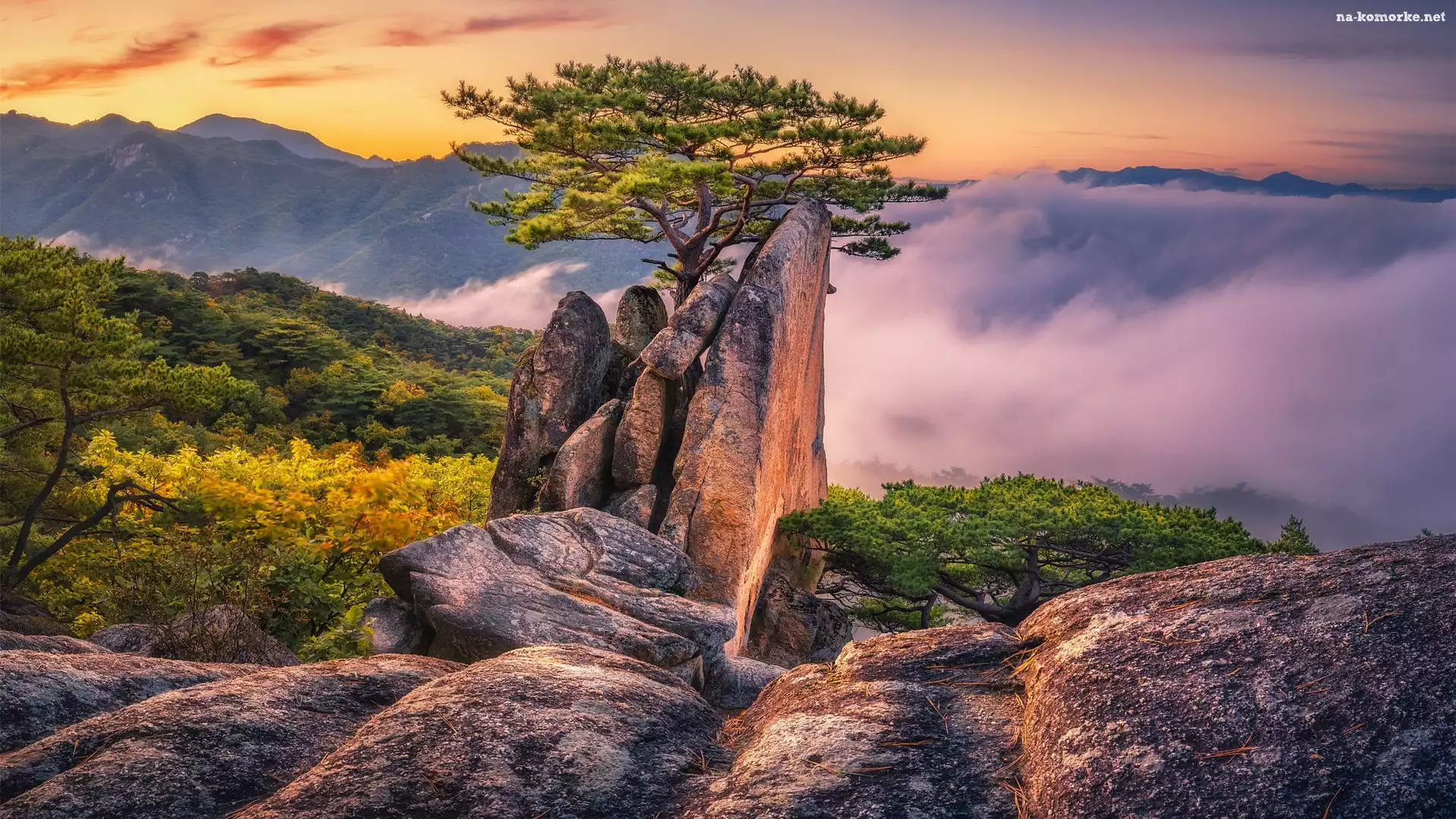 Sosna, Wschód słońca, Drzewa, Mgła, Skały, Góry na Komórkę