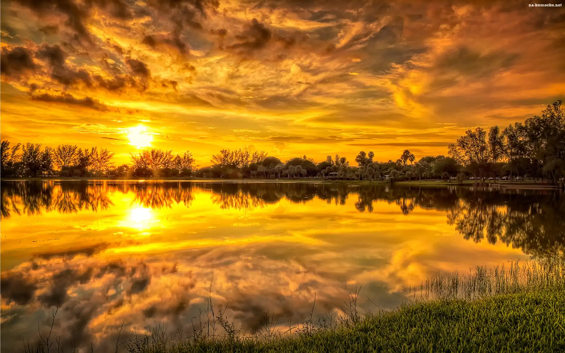 Drzewa, Chmury, Zachód, Słońca, Jezioro na Komórkę