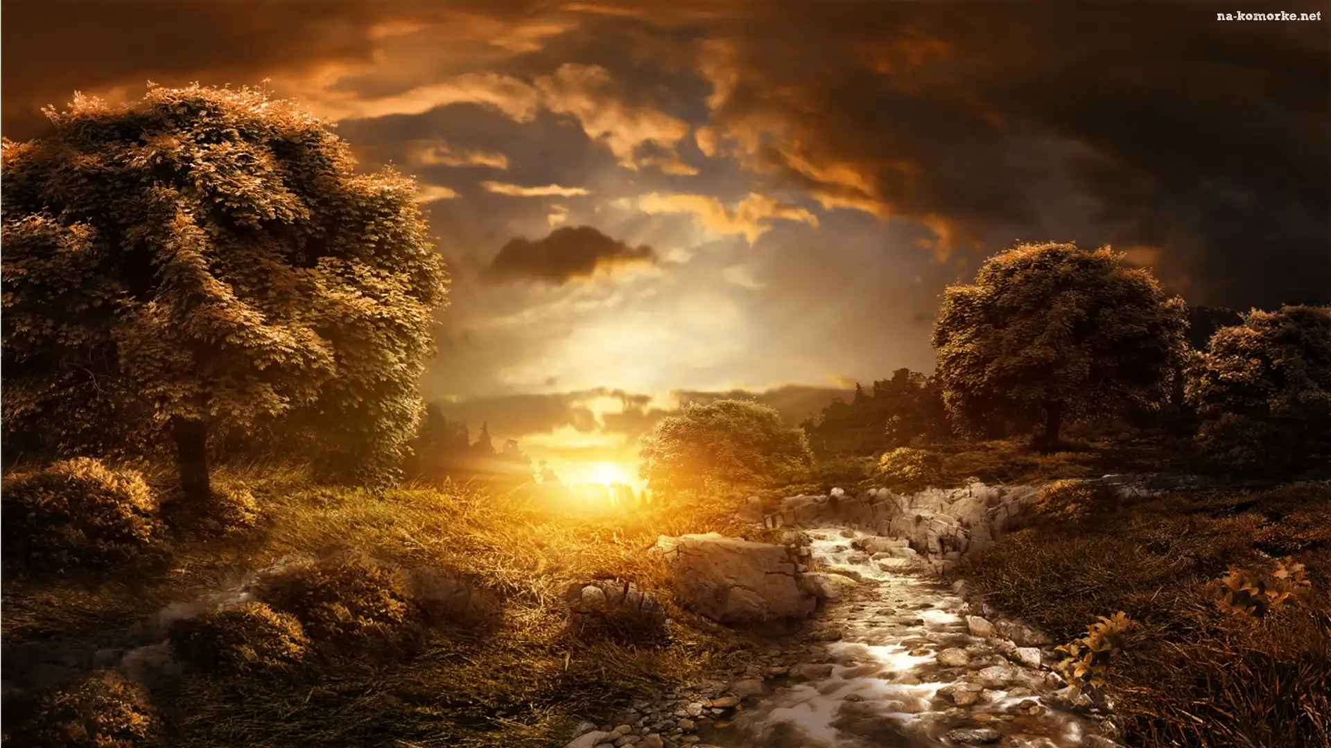 Drzewa, Chmury, Zachód, Słońca, Potok na Komórkę