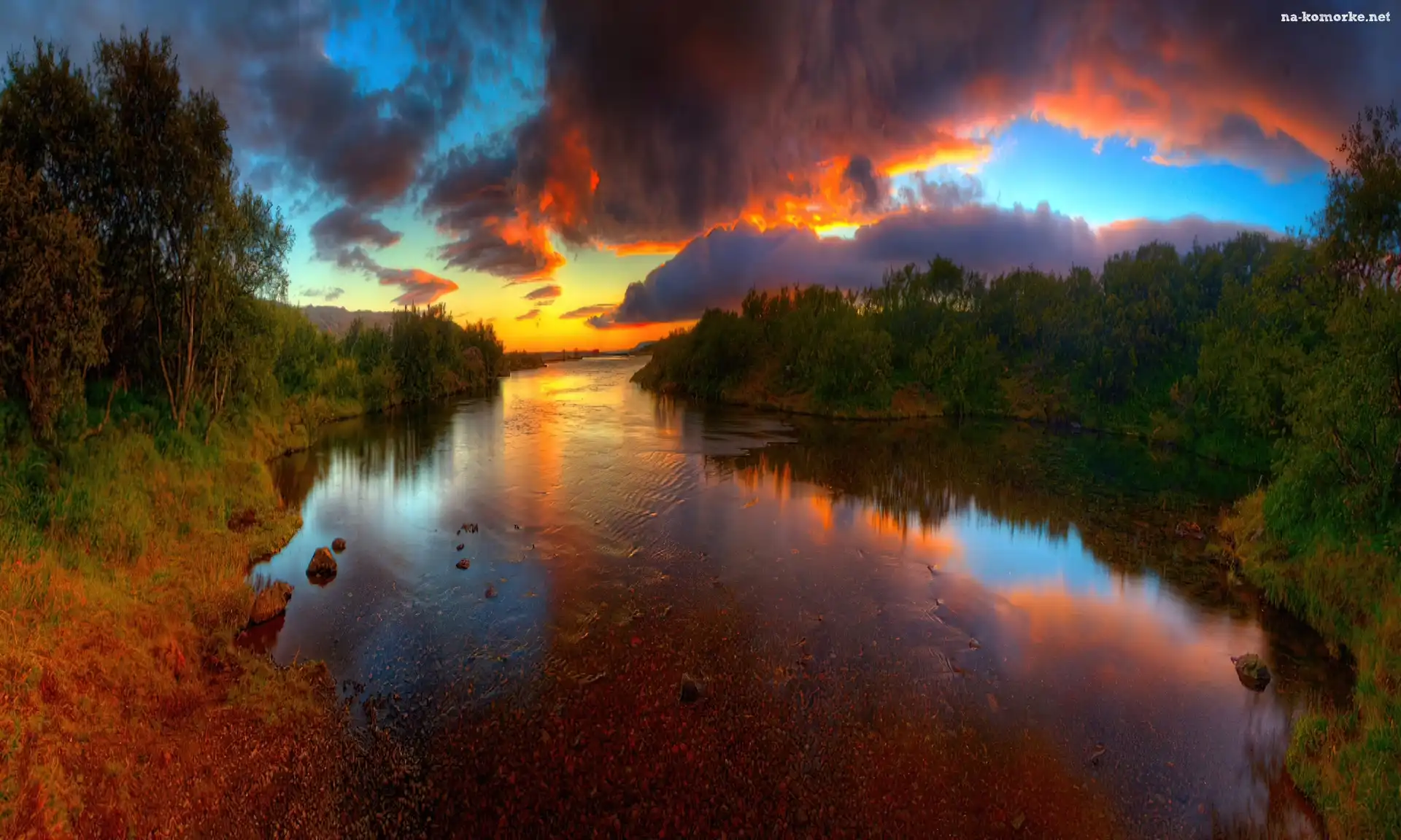 Drzewa, Rzeka, Zachód, Słońca, Chmury na Komórkę