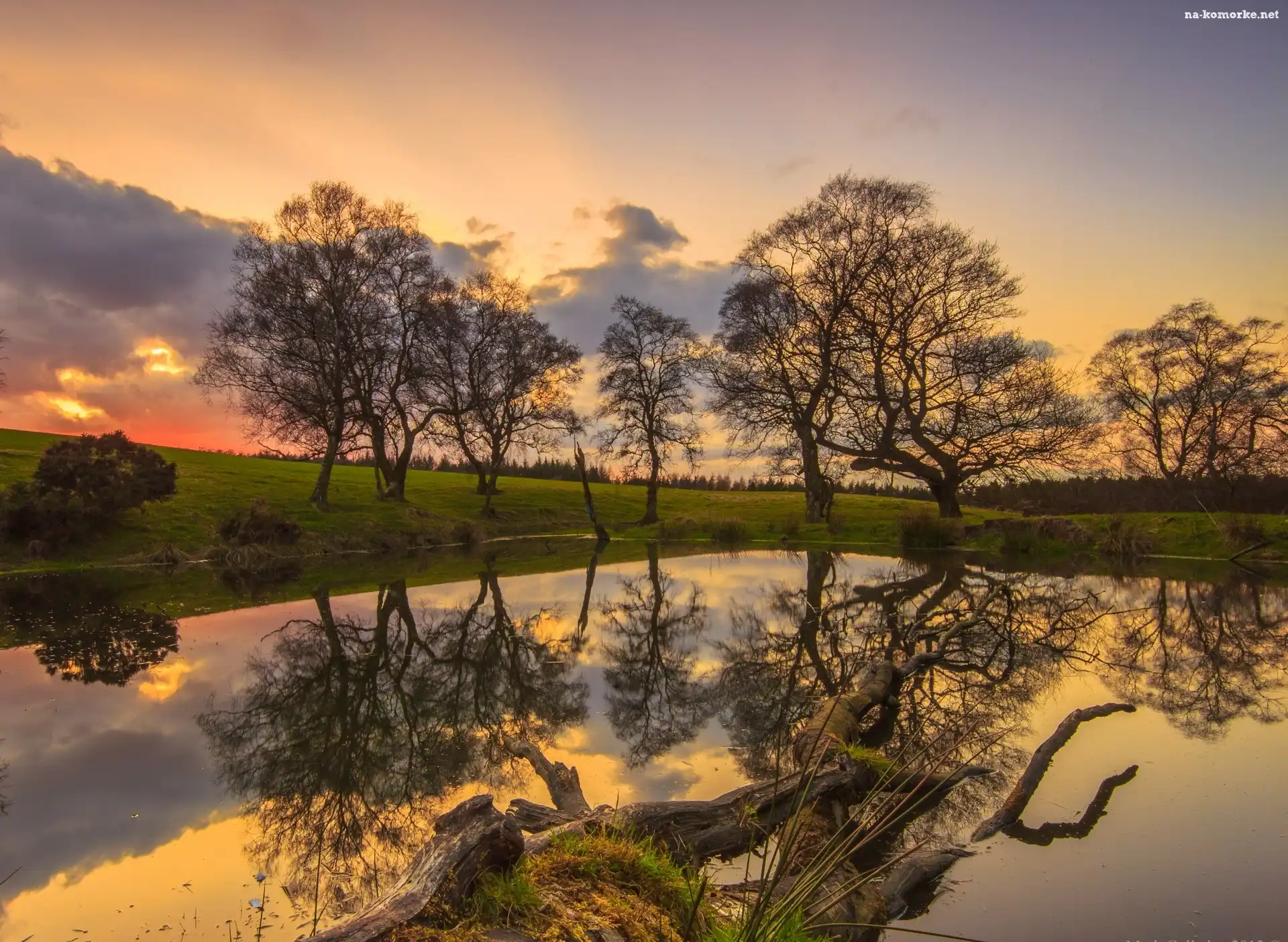 Drzewa, Staw, Zachód Słońca, Odbicie na Komórkę